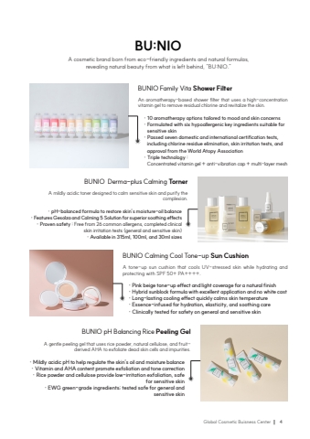 Global Cosmetic Buisness Center4BU:NIOA cosmetic brand born from eco-friendly ingredients and natural formulas, revealing natural beauty from what is left behind, %u201cBU:NIO.%u201dBUNIO Family Vita Shower FilterAn aromatherapy-based shower filter that uses a high-concentration vitamin gel to remove residual chlorine and revitalize the skin.%u00b7 10 aromatherapy options tailored to mood and skin concerns%u00b7 Formulated with six hypoallergenic key ingredients suitable for sensitive skin%u00b7 Passed seven domestic and international certification tests, including chlorine residue elimination, skin irritation tests, and approval from the World Atopy Association%u00b7 Triple technology : Concentrated vitamin gel + anti-vibration cap + multi-layer meshBUNIO Calming Cool Tone-up Sun CushionA tone-up sun cushion that cools UV-stressed skin while hydrating and protecting with SPF 50+ PA++++.%u00b7 Pink beige tone-up effect and light coverage for a natural finish%u00b7 Hybrid sunblock formula with excellent application and no white cast%u00b7 Long-lasting cooling effect quickly calms skin temperature%u00b7 Essence-infused for hydration, elasticity, and soothing care%u00b7 Clinically tested for safety on general and sensitive skinBUNIO Derma-plus Calming TornerA mildly acidic toner designed to calm sensitive skin and purify the complexion. %u00b7 pH-balanced formula to restore skin%u2019s moisture-oil balance %u00b7 Features Gesolza and Calming 5 Solution for superior soothing effects %u00b7 Proven safety : Free from 26 common allergens, completed clinical skin irritation tests (general and sensitive skin) %u00b7 Available in 315ml, 100ml, and 30ml sizesBUNIO pH Balancing Rice Peeling GelA gentle peeling gel that uses rice powder, natural cellulose, and fruitderived AHA to exfoliate dead skin cells and impurities.%u00b7 Mildly acidic pH to help regulate the skin%u2019s oil and moisture balance%u00b7 Vitamin and AHA content promote exfoliation and tone correction%u00b7 Rice powder and cellulose provide low-irritation exfoliation, safe for sensitive skin%u00b7 EWG green-grade ingredients; tested safe for general and sensitive skin