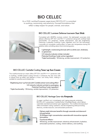 Global Cosmetic Buisness Center6BIO CELLECAs a VIVA-certified European vegan brand, BIOCELLEC is committed to soothing, moisturizing, and sensitivity-focused formulations that reflect a deep respect for people, animals, and nature.BIO CELLEC Lumiere Defense IcecreamSun StickFormulated with 28.89% moisture content, this lightweight sunscreen stick delivers effective SPF 50+ and PA+++ protection along with certified triple functionality: UV protection, wrinkle improvement, and skin brightening. Featuring a patented Soothing Cooler ingredient and Sol-Gel technology, it provides an immediate cooling effect to lower skin temperature during hot weather while controlling sebum and minimizing pores.%u00b7 Lightweight, moisturizing formula with no white cast, stickiness, or greasiness%u00b7 UV intensity indicator sticker included%u00b7 Patented Soothing Cooler active ingredient%u00b7 Triple functionality : Whitening, wrinkle improvement, UV protectionBIO CELLEC Centella CoolingTone-up Sun CreamThis multifunctional sun cream offers SPF 50+ and PA++++ protection with a soothing, centella-based cooling formula. It enhances the skin tone with a natural tone-up effect and delivers a moist, non-sticky finish, making it suitable for sensitive and irritated skin.%u00b7 Brightening tone-up formula with Centella extract and cooling effect%u00b7 UV intensity indicator printed on packaging%u00b7 Patented Soothing Cooler ingredient%u00b7 Triple functionality : Whitening, wrinkle improvement, UV protectionBIO CELLEC Heritage Cera-diaAmpouleA vegan-certified, non-comedogenic anti-aging ampoule containing BIOCELLEC%u2019s proprietary Cooling Perfect Snowflake Beads, which deliver ceramides and diamond extract upon application. This multifunctional product offers immediate cooling, hydration, and skin brightening while promoting elasticity, wrinkle reduction, and antioxidant protection.%u00b7 Delivers eight skincare benefits through ceramide and diamond- infused beads%u00b7 10,500ppm high-concentration ceramide with innovative capsule formulation%u00b7 Functional effects : Whitening, wrinkle improvement, elasticity enhancement, hydration, antioxidant protection, cooling, vitamin delivery, and soothing