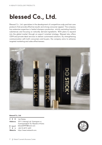 K-BEAUTY EXCELLENT PRODUCTS7Global Cosmetic Buisness Centerblessed Co., Ltd.Jay Hwang109-1, Eobongji-gil, Gyeongsan-si, Gyeongsangbuk-do, Republic of Koreablessed0999@naver.com+82 70-8717-6291https://www.herbearth.comblessed Co., Ltd.Blessed Co., Ltd. specializes in the development of competitive scalp and hair care products that provide effective results and strong consumer appeal. The company has extensive expertise in herbal shampoo production, strictly excluding harmful substances and focusing on naturally derived ingredients. With plans to expand into the global market through an export-oriented strategy, Blessed also offers OEM and private label services to deliver customized solutions. By strengthening communication with both consumers and buyers, the company aims to enhance targeted marketing and sales effectiveness.CEOAddressE-mailTELWebsite