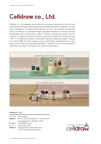 K-BEAUTY EXCELLENT PRODUCTS9Global Cosmetic Buisness CenterCelldraw co., Ltd.Do Hyoungrog#304, 738, Samseonghyeon-ro, Gyeongsan-si, Gyeongsangbuk-do, Republic of Koreacelldraw@naver.com+82 53-852-2578(Celldraw) https://www.celldraw.com(THE IT) https://www.theit.beautyCelldraw Co., Ltd. Celldraw Co., Ltd. develops and distributes customized skincare and anti-hair loss solutions along with specialized beauty devices designed for effective delivery. Guided by the philosophy of %u201cproducts that families can use,%u201d the company emphasizes safety and efficacy. It operates through specialized distribution channels including dermatology clinics and aesthetic salons. Celldraw manages two distinct brands: %u201cCelldraw,%u201d a high-performance medical cosmetics line tailored for clinical use, and %u201cTHE IT,%u201d a retail brand rooted in sustainability and clean beauty principles. Through its in-house R&D lab, the company creates scientifically validated products using vegan, low-irritation, and upcycled ingredients. Celldraw%u2019s products are exported to more than 10 countries, including China and the United States.CEOAddressE-mailTELWebsite