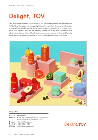 K-BEAUTY EXCELLENT PRODUCTS11Global Cosmetic Buisness CenterDelight, TOVLee Jungyun#304, 738, Samseonghyeon-ro, Gyeongsan-si, Gyeongsangbuk-do, Republic of Korea Koreatov@tovstyle.com+82 2-6334-4756https://www.tovegan.comDelight, TOVThis antioxidant skincare line focuses on the phytochemicals found in food colors, highlighting the robust life energy of plants rich in nutrients. These phytochemicals are beneficial physiologically active substances that give food its unique color, taste, and aroma, and are abundantly present in fruits and vegetables with vibrant and diverse colors. We eliminate unnecessary animal testing and harmful ingredients, conveying a message of harmony between humans and nature.CEOAddressE-mailTELWebsite