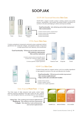 Global Cosmetic Buisness Center14SOOPJAKTonerSerumNourishingCreamSOOPJAK Sesameall Naturalize Skin CareSOOPJAK%u2019s original cosmetic product contains sesame and perilla extracts, lactobacillus, and sesame fermented filtrate, providing rich nutrition to the skin and helping to whiten and improve wrinkles.%u00b7 Dual functionality : skin whitening and wrinkle improvement%u00b7 Skin moisturizationcontains sesame extract, perilla extractcontains sesame fermented filtratecontains lactobacilluscontains niacinamideEssence TonerAmpouleCreamVITAL Repair Skin CareContains polyphenol components extracted using a patented method, glutathione, low-molecular collagen, and peptide complex components to help improve skin tone, elasticity, and nourishment.%u00b7 Dual functionality : Whitening and wrinkle improvement%u00b7 Skin elasticity improvement%u00b7 Skin nutrition restorationContains sesame extract and perilla extractContains low-molecular-weight collagenContains glutathioneContains peptide complex ingredientsTonerAmpouleHEMP Cica Skin CareContains hemp seed oil, mugwort extract, and cica complex ingredients to help replenish moisture in dry skin and alleviate skin troubles.%u00b7 Dual functionality : Whitening and wrinkle improvement%u00b7 Skin moisture replenishment%u00b7 Helps soothe skin and alleviate troublesContains hemp seed oilContains mugwort extractContains cica complex ingredientsHAMPCICABRIGHTENINGCOLLAGENDaily Ampoule Mask Pack - 3 TypesThe three types of daily ampoule mask packs contain highly effective ampoule ingredients that help soothe the skin, improve tone, and strengthen elasticity, providing intensive care tailored to your skin condition.%u00b7 Hemp Sica : Skin soothing and moisture replenishment%u00b7 Brightening : Skin radiance and tone improvement%u00b7 Collagen : Skin elasticity, luster enhancement,and nutrient replenishment