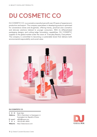 K-BEAUTY EXCELLENT PRODUCTS15Global Cosmetic Buisness CenterDU COSMETIC COBaek Ukjin780-6, Namcheon-ro Gyeongsan-si Gyeongbuk-do, Republic of Korea uj854@naver.com+82 53-801-4500https://www.ducos.co.krDU COSMTETIC CODU COSMETIC CO. is a cosmetics manufacturer with over 20 years of experience in production and export. The company specializes in developing products optimized for convenience stores and drugstores, offering trendy, practical color cosmetics and skincare solutions tailored to younger consumers. With its differentiated packaging designs and cutting-edge formulation capabilities, DU COSMETIC supplies to the global market under the vision of %u201cEveryday Beauty, Everywhere.%u201d The company is committed to becoming a sustainable brand that delivers both environmental responsibility and social value.CEOAddressE-mailTELWebsite