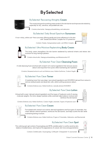 Global Cosmetic Buisness Center18BySelectedBySelected Recovering Almighty CreamThis moisturizing and nourishing cream protects the skin barrier and improves skin elasticity, especially for dry, sensitive, and problematic skin.Contains shea butter, Hwangryunhaedoktang, and adenosineBySelected Ultra Moisture Replenishing Body CreamThis body cream strengthens the skin barrier weakened by external irritants and retains skin moisture for long-lasting hydration.Contains shea butter, Hwangryunhaedoktang, and Botaniceutical-10BySelected Pure Clean TornerA hydrating toner that uses deep-sea natural ingredients and AHA/BHA derived from nature to remove residual waste and dead skin cells, while soothing excessive sebum.Contains Ecklonia cava, Hizikia fusiforme, naturally derived AHA/BHABySelected Pure Clean CreamFormulated with mineral-rich marine-derived ingredients and five types of ceramides, this cream delivers intense hydration, reinforces the skin barrier, and helps soothe the skin while maintaining lasting moisture.Contains Ecklonia cava, Hizikia fusiforme, 5 types of Ceramides, Adenosine, and NiacinamideBySelected Daily Broad Spectrum SunscreenA non-sticky, white cast-free sunscreen offering gentle and close adherence to the skin with Tanaka and White Complex for UV protection.Contains Tanaka, Saengmaeksan water, and White ComplexBySelected Pure Clean Cleansing FoamA mild cleansing foam enriched with mineral-rich marine ingredients that removes excess sebum and impurities from pores while maintaining skin hydration.Contains Seaweed extracts such as Ecklonia cava, Hizikia fusiforme, Codium fragileBySelected Pure Clean LotionInfused with ocean-derived natural ingredients and five types of hyaluronic acid of varying molecular weights, this lotion deeply hydrates while ceramide helps balance moisture and reinforce the skin barrier.Contains Ecklonia cava, Hizikia fusiforme, Codium fragile, ceramide, 5 types of hyaluronic acidBySelected Pure Clean SpotThis calming spot gel contains Siryeongtang and 80% centella water to soothe sensitive skin, balance troubled areas, and improve the appearance of uneven skin tone and pigmentation.Contains Centella water, Siryeongtang, Caffeoylsh-Octapeptide-4, niacinamide