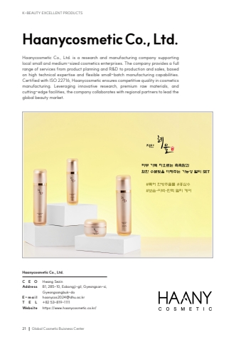 K-BEAUTY EXCELLENT PRODUCTS21Global Cosmetic Buisness CenterHaanycosmetic Co., Ltd.Hwang SezinB1, 285-10, Eobongji-gil, Gyeongsan-si, Gyeongsangbuk-dohaanycos2024@dhu.ac.kr+82 53-819-1111https://www.haanycosmetic.co.kr/Haanycosmetic Co., Ltd.Haanycosmetic Co., Ltd. is a research and manufacturing company supporting local small and medium-sized cosmetics enterprises. The company provides a full range of services from product planning and R&D to production and sales, based on high technical expertise and flexible small-batch manufacturing capabilities. Certified with ISO 22716, Haanycosmetic ensures competitive quality in cosmetics manufacturing. Leveraging innovative research, premium raw materials, and cutting-edge facilities, the company collaborates with regional partners to lead the global beauty market.CEOAddressE-mailTELWebsite