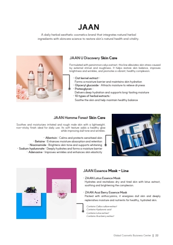 Global Cosmetic Buisness Center22JAANA daily herbal aesthetic cosmetics brand that integrates natural herbal ingredients with skincare science to restore skin%u2019s natural health and vitality.JAAN U DiscoverySkin CareFormulated with persimmon calyx extract, this line alleviates skin stress caused by external stimuli and roughness. It helps restore skin balance, improves brightness and wrinkles, and promotes a vibrant, healthy complexion.%u00b7 Oat kernel extract : Forms a moisture barrier and maintains skin hydration%u00b7 Glyceryl glucoside : Attracts moisture to relieve dryness%u00b7 Proteoglycan : Delivers deep hydration and supports long-lasting moisture%u00b7 10 types of herbal extracts : Soothe the skin and help maintain healthy balanceJAAN Essence Mask - Line%u00b7 ZAAN Lotus Essence MaskHydrates and revitalizes dry and tired skin with lotus extract, soothing and brightening the complexion.%u00b7 ZAAN Acai Berry Essence MaskPacked with anthocyanins, it energizes dull skin and deeply replenishes moisture and nutrients for healthy, hydrated skin.Contains Callus culture extractContains Hyaluronic acidContains Lotus extractContains Acai berry extractJAAN Homme Forest Skin Care Soothes and moisturizes irritated and rough male skin with a lightweight, non-sticky finish ideal for daily use. Its soft texture adds a healthy glow while improving dull tone and wrinkles.%u00b7 Allantoin : Calms and protects sensitized skin%u00b7 Betaine : Enhances moisture absorption and retention%u00b7 Niacinamide : Brightens skin tone and supports whitening%u00b7 Sodium hyaluronate : Deeply hydrates and forms a moisture barrier%u00b7 Adenosine : Improves wrinkles and enhances skin elasticity