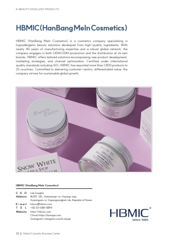 K-BEAUTY EXCELLENT PRODUCTS23Global Cosmetic Buisness CenterHBMIC(HanBang MeIn Cosmetics)Lee Sungha#209, 125, Jisiksaneop-ro, Hayang-eup, Gyeongsan-si, Gyeongsangbuk-do, Republic of Koreahbmic@hbmic.com+82 53-588-8899https://hbmic.com(Store) https://brecipe.com(Instagram) instagram.com/b.recipeHBMIC (HanBang MeIn Cosmetics)HBMIC (HanBang MeIn Cosmetics) is a cosmetics company specializing in hypoallergenic beauty solutions developed from high-quality ingredients. With nearly 40 years of manufacturing expertise and a robust global network, the company engages in both OEM/ODM production and the distribution of its own brands. HBMIC offers tailored solutions encompassing new product development, marketing strategies, and channel optimization. Certified under international quality standards including ISO, HBMIC has exported more than 1,800 products to 23 countries. Committed to delivering customer-centric, differentiated value, the company strives for sustainable global growth.CEOAddressE-mailTELWebsite