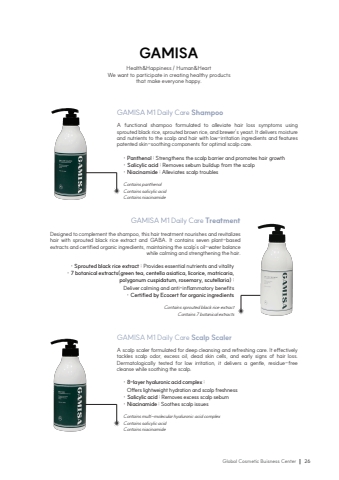 Global Cosmetic Buisness Center26GAMISAHealth&Happiness / Human&HeartWe want to participate in creating healthy products that make everyone happy.GAMISA M1 Daily Care ShampooA functional shampoo formulated to alleviate hair loss symptoms using sprouted black rice, sprouted brown rice, and brewer%u2019s yeast. It delivers moisture and nutrients to the scalp and hair with low-irritation ingredients and features patented skin-soothing components for optimal scalp care.%u00b7 Panthenol : Strengthens the scalp barrier and promotes hair growth%u00b7 Salicylic acid : Removes sebum buildup from the scalp%u00b7 Niacinamide : Alleviates scalp troublesContains panthenolContains salicylic acidContains niacinamideGAMISA M1 Daily Care Scalp ScalerA scalp scaler formulated for deep cleansing and refreshing care. It effectively tackles scalp odor, excess oil, dead skin cells, and early signs of hair loss. Dermatologically tested for low irritation, it delivers a gentle, residue-free cleanse while soothing the scalp.%u00b7 8-layer hyaluronic acid complex : Offers lightweight hydration and scalp freshness%u00b7 Salicylic acid : Removes excess scalp sebum%u00b7 Niacinamide : Soothes scalp issuesContains multi-molecular hyaluronic acid complexContains salicylic acidContains niacinamideGAMISA M1 Daily Care Treatment Designed to complement the shampoo, this hair treatment nourishes and revitalizes hair with sprouted black rice extract and GABA. It contains seven plant-based extracts and certified organic ingredients, maintaining the scalp%u2019s oil-water balance while calming and strengthening the hair.%u00b7 Sprouted black rice extract : Provides essential nutrients and vitality%u00b7 7 botanical extracts(green tea, centella asiatica, licorice, matricaria, polygonum cuspidatum, rosemary, scutellaria) : Deliver calming and anti-inflammatory benefits%u00b7 Certified by Ecocert for organic ingredientsContains sprouted black rice extract Contains 7 botanical extracts