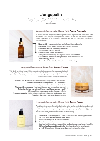 Global Cosmetic Buisness Center34JangspolinJangspolin aims to offer products that allow more people to enjoy healthy beauty through the convergence of fermentation science and aromatherapy.Jangspolin Fermentation Biome Total Aroma AmpouleA dual-functional ampoule (whitening and wrinkle improvement) formulated with fermented Galactomyces from premium strains. Made with low-irritation plantbased ingredients, it is suitable for sensitive skin and has completed human skin irritation testing.%u00b7Niacinamide : Improves skin tone and offers whitening benefits%u00b7Adenosine :Helps reduce wrinkles and improve elasticity%u00b7Panthenol, betaine, sodium hyaluronate : Soothe and moisturize the skin%u00b7Galactomyces, bifida, lactobacillus : Strengthen skin immunity and improve overall skin condition%u00b7Low-irritation plant-derived ingredients : Safe for sensitive skin%u00b7Aromatherapy effect : Calms the mind and body with natural essential oil fragrancesJangspolin Fermentation Biome Total Aroma CreamThis dual-functional cream(whitening and wrinkle improvement) enhances antioxidant and brightening effects using vitamin tree water. Probiotic-fermented propolis boosts skin resilience, elasticity, and antioxidant activity. Safe for sensitive skin and infused with aromatic oils for added emotional care.%u00b7 Vitamin tree water : Boosts antioxidant and brightening performance.%u00b7 Lactobacillus-fermented propolis (120,000ppm) :Improves skin resilience and elasticity%u00b7 Niacinamide, adenosine : Provide whitening and wrinkle improvement%u00b7 Naturally derived ingredients (honey, scutellaria, ginger, yuzu) :Offer soothing, moisturizing, and antioxidant effects%u00b7 Aromatherapy oils : Aid in sebum regulation, relaxation, and trouble care%u00b7Arginine, allantoin : Nourish and calm the skinJangspolin Fermentation Biome Total Aroma SerumA multifunctional serum formulated with lotus water and fermented lotus seed extract using Lactobacillus. It provides four total care functions-soothing, whitening, wrinkle improvement, and aromatherapy. Combines the benefits of skin toner and lotion to deliver balanced hydration and oil control post-cleansing.%u00b7 Lotus water (700,000ppm) : Offers antioxidant and soothing properties%u00b7 Lactobacillus-fermented lotus seed extract : Enhances absorption of active ingredients%u00b7 Four-in-one care : Soothes, brightens, improves wrinkles, and delivers aromatherapy benefits%u00b7 90% naturally derived ingredients : Gentle and safe for sensitive skin%u00b7 pH 5.6 : Strengthens skin barrier and prevents external irritation