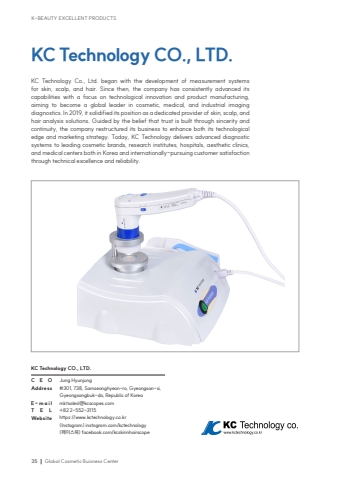 K-BEAUTY EXCELLENT PRODUCTS35Global Cosmetic Buisness CenterKC Technology CO., LTD.Jung Hyunjung#301, 738, Samseonghyeon-ro, Gyeongsan-si, Gyeongsangbuk-do, Republic of Koreamktsalesl@kcscopes.com+82 2-552-3115https://www.kctechnology.co.kr(Instagram) instagram.com/kctechnology(%ud398%uc774%uc2a4%ubd81) facebook.com/kcskinnhairscopeKC Technology CO., LTD.KC Technology Co., Ltd. began with the development of measurement systems for skin, scalp, and hair. Since then, the company has consistently advanced its capabilities with a focus on technological innovation and product manufacturing, aiming to become a global leader in cosmetic, medical, and industrial imaging diagnostics. In 2019, it solidified its position as a dedicated provider of skin, scalp, and hair analysis solutions. Guided by the belief that trust is built through sincerity and continuity, the company restructured its business to enhance both its technological edge and marketing strategy. Today, KC Technology delivers advanced diagnostic systems to leading cosmetic brands, research institutes, hospitals, aesthetic clinics, and medical centers both in Korea and internationally-pursuing customer satisfaction through technical excellence and reliability.CEOAddressE-mailTELWebsite