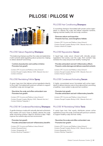 Global Cosmetic Buisness Center42PILLOSE | PILLOSE WPILLOSE Hair Conditioning ShampooA nourishing shampoo formulated with proven active ingredients to cleanse the scalp and deliver essential nutrients,helping maintain healthy hair and scalp condition.%u00b7 Removes sebum and impurities%u00b7 Prevents hair loss, and strengthens folliclesContains OPC (Licorice and Phellinus Linteus Extracts)Contains Procapil Complex (Biotinyl-GHK, Oleanolic Acid, etc.)Contains Vitamin B ComplexPILLOSE Condensed Activating SerumA highly concentrated serum formulated with active ingredients to deliver intensive care to the scalp and hair, promotinga healthier, more resilient scalp and hair condition.%u00b7 Promotes hair growth%u00b7 Provides antioxidant and anti-inflammatory benefitsContains OPC (Licorice and Phellinus Linteus Extracts)Contains Procapil Complex (Biotinyl-GHK, Oleanolic Acid, etc.)PILLOSE Revitalizing Follicle SprayA spray-type tonic that delivers active ingredients directly to the scalp. Formulated with premium nutrients to support a healthier scalp and stronger hair.%u00b7 Nourishes the scalp and offers antioxidant care%u00b7 Promotes hair growthContains OPC (Licorice and Phellinus Linteus Extracts)Contains Procapil Complex (Biotinyl-GHK, Oleanolic Acid, etc.)Contains Palmitoyl Tripeptide-1PILLOSE Sebum Regulating ShampooThis balancing shampoo purifies the scalp and replenishes it with nutrients while regulating sebum production, helping to relieve dandruff and itching.%u00b7 Controls oil production and soothes irritation%u00b7 Promotes hair growthContains OPC (Licorice and Phellinus Linteus Extracts)Contains Procapil Complex (Biotinyl-GHK, Oleanolic Acid, etc.) Contains Unitrienol PILLOSE Rejuvenation SerumA liquid-type scalp serum infused with clinically proven ingredients that evenly coat the scalp. Rich nutrients help revitalize the scalp and promote healthy-looking hair.%u00b7 Provides antioxidant and anti-inflammatory effects%u00b7 Prevents cuticle damage and delivers essential nutrientsContains OPC (Licorice and Phellinus Linteus Extracts)Contains Procapil Complex (Biotinyl-GHK, Oleanolic Acid, etc.) Contains Palmitoyl Tripeptide-1PILLOSE W Condensed Revitalizing ShampooA gentle shampoo made with naturally derived surfactants that creates soft micro-foam to deeply cleanse the scalp while minimizing irritation-ideal for sensitive scalps. Helps improve the overall scalp and hair environment.%u00b7 Promotes hair growth%u00b7 Provides antioxidant and anti-inflammatory benefitsContains OPC (Licorice and Phellinus Linteus Extracts)Contains Flaxseed ExtractContains Tetrapeptide-32Contains Nicotinoyl Tripeptide-1PILLOSE W Revitalizing Follicle TonicA spray-type tonic that evenly distributes proven active ingredients across the scalp. Enriched with premium nutrients to support healthy scalp and hair vitality.%u00b7 Nourishes the scalp and offers antioxidant care%u00b7 Promotes hair growthContains OPC (Licorice and Phellinus Linteus Extracts)Contains Procapil Complex (Biotinyl-GHK, Oleanolic Acid, etc.)Contains Biopeptide-Zn/Cu Contains Palmitoyl Tripeptide-1
