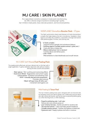 Global Cosmetic Buisness Center44MJ CARE | SKIN PLANETAs a specialized cosmetics company in mask pack manufacturing, we offer a diverse range of products including high-quality, low-irritation mask packs, basic skincare products, and functional patches.SKINPLANET Biomeflora Booster Pack - 3TypesThis high-performance sheet mask features a 6-biotic fermentation complex that helps balance the skin%u2019s microbiome. Available in three types to suit daily skin conditions, it promotes a stronger skin barrier while delivering glow, firmness, and calming care.%u00b7 6-biotic complex : Supports barrier strength and microbiome balance%u00b7 Soothing agents (Centella asiatica extract, xylitol, etc.) : Cools and calms irritated skin%u00b7 Walnut shell extract (rich in tannins) : Controls sebum and refines pores%u00b7 LHA + PHA : Mild exfoliation to clear blackheads and smooth textureMJ CARE Soft Miracle Foot Peeling PackThis peeling pack effectively removes callused skin on the feet with a single application. It gently exfoliates dead skin cells without irritation, leaving the feet smooth and hydrated.%u00b7 Beta-glucan : Skin-soothing and moisturizing effects%u00b7 Snail mucin filtrate : Regeneration and nutrient supply%u00b7 Lemon extract : Exfoliation and refreshing scent%u00b7 AHA + naturally derived acid components :Promotes callus removal%u00b7 Wash-off type (rinse off after use) :Convenient and hygienic useMild Peeling & Toner PadThis low-irritation peeling toner pad is designed with one textured side for exfoliation and a soft side for gentle care. It effectively removes dead skin cells, refines skin texture, and can be used conveniently before going out, after returning home, or after cleansing.%u00b7 Powerful exfoliating side + soft side : Refines skin and controls excess oil%u00b7 Low-irritation formula : Gentle and safe for sensitive skin%u00b7 Tea tree leaf extract : Calms and helps prevent breakouts%u00b7 Centella asiatica extract : Soothes and tightens irritated skin%u00b7 Hyaluronic acid : Deeply hydrates and locks in moisture
