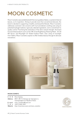 K-BEAUTY EXCELLENT PRODUCTS47Global Cosmetic Buisness CenterMOON COSMETICMoon Sojeong#507, 285-10, Eobongji-gil, Gyeongsan-si, Gyeongsangbuk-do, Republic of Koreamoon_cosmetics@naver.com+82 10-3069-9697https://smartstore.naver.com/moon_cosmeticsMOON COSMETICMoon Cosmetics was established with the moon goddess Selene, a symbol of eternal beauty, as its inspiration. Aiming to provide more than conventional skincare, the brand is devoted to supporting a healthy and beautiful lifestyle. Moon Cosmetics addresses customers%u2019 skin concerns with trust and delivers soothing care using its patented hydrogel material, rigorously selected ingredients, and a commitment to quality control. Prioritizing the restoration of the skins natural strength, the brand has launched products such as the 24K Snow Brightening Shearing Mask, JinCell NK Serum, and Moonlight UV Shield Outdoor Patch. Like a drop of moonlight from Selene, Moon Cosmetics aspires to offer timeless beauty through its skincare innovations.CEOAddressE-mailTELWebsite