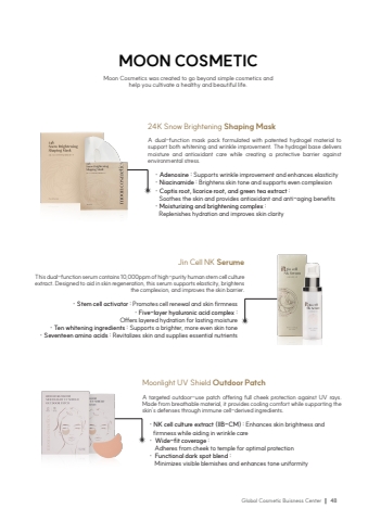 Global Cosmetic Buisness Center48MOON COSMETICMoon Cosmetics was created to go beyond simple cosmetics and help you cultivate a healthy and beautiful life.24K Snow Brightening Shaping MaskA dual-function mask pack formulated with patented hydrogel material to support both whitening and wrinkle improvement. The hydrogel base delivers moisture and antioxidant care while creating a protective barrier against environmental stress.%u00b7 Adenosine : Supports wrinkle improvement and enhances elasticity%u00b7 Niacinamide : Brightens skin tone and supports even complexion%u00b7 Coptis root, licorice root, and green tea extract : Soothes the skin and provides antioxidant and anti-aging benefits%u00b7 Moisturizing and brightening complex : Replenishes hydration and improves skin clarityJin Cell NK SerumeThis dual-function serum contains 10,000ppm of high-purity human stem cell culture extract. Designed to aid in skin regeneration, this serum supports elasticity, brightens the complexion, and improves the skin barrier.%u00b7 Stem cell activator : Promotes cell renewal and skin firmness%u00b7 Five-layer hyaluronic acid complex : Offers layered hydration for lasting moisture%u00b7 Ten whitening ingredients : Supports a brighter, more even skin tone%u00b7 Seventeen amino acids : Revitalizes skin and supplies essential nutrientsMoonlight UV Shield Outdoor PatchA targeted outdoor-use patch offering full cheek protection against UV rays. Made from breathable material, it provides cooling comfort while supporting the skin%u2019s defenses through immune cell-derived ingredients.%u00b7 NK cell culture extract (IIB-CM) : Enhances skin brightness and firmness while aiding in wrinkle care%u00b7 Wide-fit coverage : Adheres from cheek to temple for optimal protection%u00b7 Functional dark spot blend : Minimizes visible blemishes and enhances tone uniformity