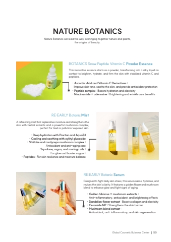 Global Cosmetic Buisness Center50NATURE BOTANICSNature Botanics will lead the way in bringing together nature and plants, the origins of beauty.RE:EARLY Botanic SerumDesigned to fight daily skin stress, this serum calms, hydrates, and revives the skin%u2019s clarity. It features a golden flower and mushroom blend to enhance glow and fight signs of aging.%u00b7 Golden hibiscus + mushroom extracts : Anti-inflammatory, antioxidant, and brightening effects%u00b7 Dandelion flower extract : Boosts collagen and elasticity%u00b7 Ceramide NP : Strengthens the skin barrier%u00b7 Mushroom blend extract : Antioxidant, anti-inflammatory, and skin regenerationRE:EARLY Botanic Mist A refreshing mist that replenishes moisture and strengthens the skin with herbal extracts and a powerful mushroom complex, perfect for tired or pollution-exposed skin.%u00b7 Deep hydration with Proctan and AquaZil%u00b7 Cooling and soothing with xylityl glucoside%u00b7 Shiitake and cordyceps mushroom complex : Antioxidant and anti-aging care%u00b7 Squalane, argan, and moringa oils : For glow and barrier support%u00b7 Peptides : For skin resilience and moisture balanceBOTANICS Snow Peptide Vitamin C Powder Essence This innovative essence starts as a powder, transforming into a silky liquid on contact to brighten, hydrate, and firm the skin with stabilized vitamin C and peptides.%u00b7 Ascorbic Acid and Vitamin C Derivatives : Improve skin tone, soothe the skin, and provide antioxidant protection%u00b7 Peptide complex : Boosts hydration and elasticity%u00b7 Niacinamide + adenosine : Brightening and wrinkle care benefits
