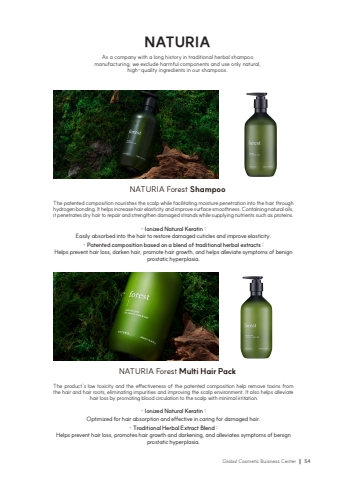 Global Cosmetic Buisness Center54NATURIAAs a company with a long history in traditional herbal shampoo manufacturing, we exclude harmful components and use only natural, high-quality ingredients in our shampoos.The patented composition nourishes the scalp while facilitating moisture penetration into the hair through hydrogen bonding. It helps increase hair elasticity and improve surface smoothness. Containing natural oils, it penetrates dry hair to repair and strengthen damaged strands while supplying nutrients such as proteins.%u00b7 Ionized Natural Keratin : Easily absorbed into the hair to restore damaged cuticles and improve elasticity.The product%u2019s low toxicity and the effectiveness of the patented composition help remove toxins from the hair and hair roots, eliminating impurities and improving the scalp environment. It also helps alleviate hair loss by promoting blood circulation to the scalp with minimal irritation.%u00b7 Ionized Natural Keratin : Optimized for hair absorption and effective in caring for damaged hair.NATURIA Forest ShampooNATURIA Forest Multi Hair Pack%u00b7 Traditional Herbal Extract Blend : Helps prevent hair loss, promotes hair growth and darkening, and alleviates symptoms of benign prostatic hyperplasia.%u00b7 Patented composition based on a blend of traditional herbal extracts : Helps prevent hair loss, darken hair, promote hair growth, and helps alleviate symptoms of benign prostatic hyperplasia.
