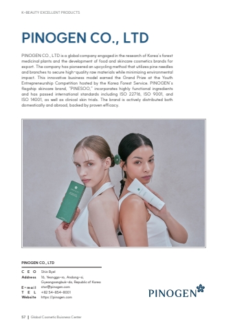 K-BEAUTY EXCELLENT PRODUCTS57Global Cosmetic Buisness CenterPINOGEN CO., LTDShin Byel16, Yeongga-ro, Andong-si, Gyeongsangbuk-do, Republic of Koreastar@pinogen.com+82 54-854-8001https://pinogen.comPINOGEN CO., LTD PINOGEN CO., LTD is a global company engaged in the research of Korea%u2019s forest medicinal plants and the development of food and skincare cosmetics brands for export. The company has pioneered an upcycling method that utilizes pine needles and branches to secure high-quality raw materials while minimizing environmental impact. This innovative business model earned the Grand Prize at the Youth Entrepreneurship Competition hosted by the Korea Forest Service. PINOGEN%u2019s flagship skincare brand, %u201cPINESOO,%u201d incorporates highly functional ingredients and has passed international standards including ISO 22716, ISO 9001, and ISO 14001, as well as clinical skin trials. The brand is actively distributed both domestically and abroad, backed by proven efficacy.CEOAddressE-mailTELWebsite