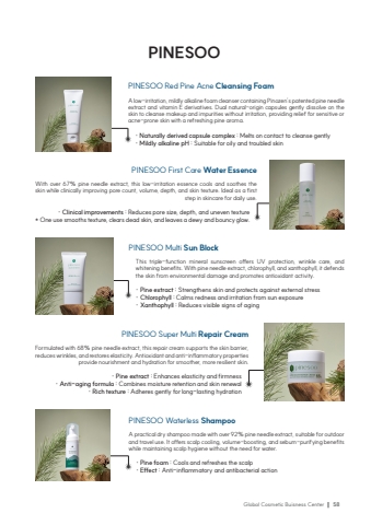 Global Cosmetic Buisness Center58PINESOOPINESOO Waterless ShampooA practical dry shampoo made with over 92% pine needle extract, suitable for outdoor and travel use. It offers scalp cooling, volume-boosting, and sebum-purifying benefits while maintaining scalp hygiene without the need for water.%u00b7 Pine foam : Cools and refreshes the scalp%u00b7 Effect : Anti-inflammatory and antibacterial actionPINESOO Super Multi Repair CreamFormulated with 68% pine needle extract, this repair cream supports the skin barrier, reduces wrinkles, and restores elasticity. Antioxidant and anti-inflammatory properties provide nourishment and hydration for smoother, more resilient skin.%u00b7 Pine extract : Enhances elasticity and firmness%u00b7 Anti-aging formula : Combines moisture retention and skin renewal%u00b7 Rich texture : Adheres gently for long-lasting hydrationPINESOO Multi Sun BlockThis triple-function mineral sunscreen offers UV protection, wrinkle care, and whitening benefits. With pine needle extract, chlorophyll, and xanthophyll, it defends the skin from environmental damage and promotes antioxidant activity.%u00b7 Pine extract : Strengthens skin and protects against external stress%u00b7 Chlorophyll : Calms redness and irritation from sun exposure%u00b7 Xanthophyll : Reduces visible signs of agingPINESOO First Care Water EssenceWith over 67% pine needle extract, this low-irritation essence cools and soothes the skin while clinically improving pore count, volume, depth, and skin texture. Ideal as a first step in skincare for daily use.%u00b7 Clinical improvements : Reduces pore size, depth, and uneven texture* One use smooths texture, clears dead skin, and leaves a dewy and bouncy glow.PINESOO Red Pine Acne Cleansing FoamA low-irritation, mildly alkaline foam cleanser containing Pinozen%u2019s patented pine needle extract and vitamin E derivatives. Dual natural-origin capsules gently dissolve on the skin to cleanse makeup and impurities without irritation, providing relief for sensitive or acne-prone skin with a refreshing pine aroma.%u00b7 Naturally derived capsule complex : Melts on contact to cleanse gently%u00b7 Mildly alkaline pH : Suitable for oily and troubled skin
