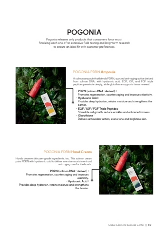 Global Cosmetic Buisness Center60POGONIAPogonia releases only products that consumers favor most, finalizing each one after extensive field testing and long-term research to ensure an ideal fit with customer preferences.POGONIA PDRN AmpouleA salmon ampoule that blends PDRN, a prized anti-aging active derived from salmon DNA, with hyaluronic acid. EGF, IGF, and FGF triple peptides penetrate deeply, while glutathione supports tissue renewal.%u00b7 PDRN (salmon DNA-derived) : Promotes regeneration, counters aging and improves elasticity.%u00b7 Hyaluronic Acid : Provides deep hydration, retains moisture and strengthens the barrier.%u00b7 EGF / IGF / FGF Triple Peptides : Stimulate cell growth, reduce wrinkles and enhance firmness.%u00b7 Glutathione : Delivers antioxidant action, evens tone and brightens skin.POGONIA PDRN Hand CreamHands deserve skincare-grade ingredients, too. This salmon cream pairs PDRN with hyaluronic acid to deliver intensive nourishment and anti-aging care for the hands.%u00b7 PDRN (salmon DNA-derived) : Promotes regeneration, counters aging and improves elasticity.%u00b7 Hyaluronic Acid : Provides deep hydration, retains moisture and strengthens the barrier.