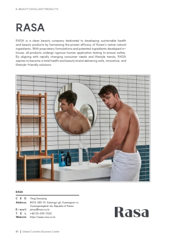 K-BEAUTY EXCELLENT PRODUCTS61Global Cosmetic Buisness CenterRASAYang Seonjong#313, 285-10, Eobongji-gil, Gyeongsan-si, Gyeongsangbuk-do, Republic of Koreajenny@rasa.co.kr+82 53-295-7533https://www.rasa.co.krRASARASA is a clean beauty company dedicated to developing sustainable health and beauty products by harnessing the proven efficacy of Korea%u2019s native natural ingredients. With proprietary formulations and patented ingredients developed inhouse, all products undergo rigorous human application testing to ensure safety. By aligning with rapidly changing consumer needs and lifestyle trends, RASA aspires to become a total health and beauty brand delivering safe, innovative, and lifestyle-friendly solutions.CEOAddressE-mailTELWebsite