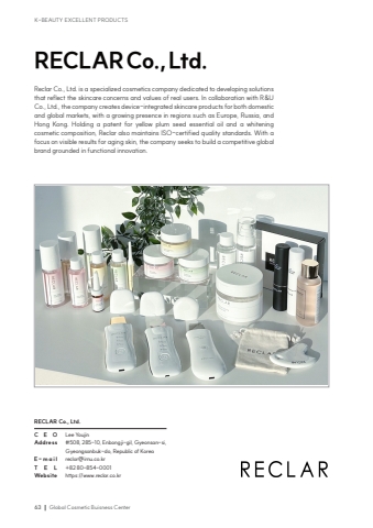 K-BEAUTY EXCELLENT PRODUCTS63Global Cosmetic Buisness CenterRECLAR Co., Ltd.Lee Youjin#508, 285-10, Enbongji-gil, Gyeonsan-si, Gyeongsanbuk-do, Republic of Koreareclar@irnu.co.kr+82 80-854-0001https://www.reclar.co.krRECLAR Co., Ltd.Reclar Co., Ltd. is a specialized cosmetics company dedicated to developing solutions that reflect the skincare concerns and values of real users. In collaboration with R&U Co., Ltd., the company creates device-integrated skincare products for both domestic and global markets, with a growing presence in regions such as Europe, Russia, and Hong Kong. Holding a patent for yellow plum seed essential oil and a whitening cosmetic composition, Reclar also maintains ISO-certified quality standards. With a focus on visible results for aging skin, the company seeks to build a competitive global brand grounded in functional innovation.CEOAddressE-mailTELWebsite