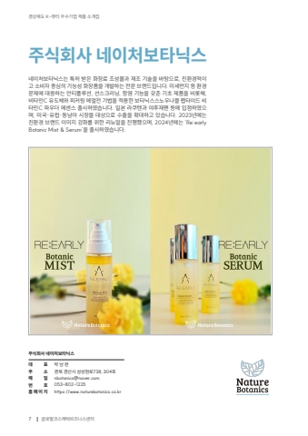 7%uacbd%uc0c1%ubd81%ub3c4 K-%ubdf0%ud2f0 %uc6b0%uc218%uae30%uc5c5 %uc81c%ud488 %uc18c%uac1c%uc9d1%uae00%ub85c%ubc8c%ucf54%uc2a4%uba54%ud2f1%ube44%uc988%ub2c8%uc2a4%uc13c%ud130%uc8fc%uc2dd%ud68c%uc0ac %ub124%uc774%ucc98%ubcf4%ud0c0%ub2c9%uc2a4%ub300 %ud45c%uc8fc %uc18c%uba54 %uc77c%ubc88 %ud638%ud648%ud398%uc774%uc9c0%ubc15 %ub0a8 %uc644%uacbd%ubd81 %uacbd%uc0b0%uc2dc %uc0bc%uc131%ud604%ub85c738, 304%ud638nbotanics@naver.com053-802-1225https://www.naturebotanics.co.kr%uc8fc%uc2dd%ud68c%uc0ac %ub124%uc774%ucc98%ubcf4%ud0c0%ub2c9%uc2a4%ub124%uc774%ucc98%ubcf4%ud0c0%ub2c9%uc2a4%ub294 %ud2b9%ud5c8 %ubc1b%uc740 %ud654%uc7a5%ub8cc %uc870%uc131%ubb3c%uacfc %uc81c%uc870 %uae30%uc220%uc744 %ubc14%ud0d5%uc73c%ub85c, %uce5c%ud658%uacbd%uc801%uc774%uace0 %uc18c%ube44%uc790 %uc911%uc2ec%uc758 %uae30%ub2a5%uc131 %ud654%uc7a5%ud488%uc744 %uac1c%ubc1c%ud558%ub294 %uc804%ubb38 %ube0c%ub79c%ub4dc%uc785%ub2c8%ub2e4. %ubbf8%uc138%uba3c%uc9c0 %ub4f1 %ud658%uacbd %ubb38%uc81c%uc5d0 %ub300%uc751%ud558%ub294 %uc548%ud2f0%ud3f4%ub8e8%uc158, %uc120%uc2a4%ud06c%ub9ac%ub2dd, %ud56d%uc5fc %uae30%ub2a5%uc744 %uac16%ucd98 %uae30%ucd08 %uc81c%ud488%uc744 %ube44%ub86f%ud574, %ube44%ud0c0%ubbfcC %uc720%ub3c4%uccb4%uc640 %ud53c%ucee4%ub9c1 %uc5d0%uba40%uc804 %uae30%ubc95%uc744 %uc801%uc6a9%ud55c %ubcf4%ud0c0%ub2c9%uc2a4%uc2a4%ub178%uc6b0%ub098%ube14 %ud3a9%ud0c0%uc774%ub4dc %ube44%ud0c0%ubbfcC %ud30c%uc6b0%ub354 %uc5d0%uc13c%uc2a4 %ucd9c%uc2dc%ud558%uc600%uc2b5%ub2c8%ub2e4. %uc77c%ubcf8 %ub77c%ucfe0%ud150%uacfc %uc57c%ud6c4%uc7ac%ud32c %ub4f1%uc5d0 %uc785%uc810%ud558%uc600%uc73c%uba70, %ubbf8%uad6d%u00b7%uc720%ub7fd%u00b7%ub3d9%ub0a8%uc544 %uc2dc%uc7a5%uc744 %ub300%uc0c1%uc73c%ub85c %uc218%ucd9c%uc744 %ud655%ub300%ud558%uace0 %uc788%uc2b5%ub2c8%ub2e4. 2023%ub144%uc5d0%ub294 %uce5c%ud658%uacbd %ube0c%ub79c%ub4dc %uc774%ubbf8%uc9c0 %uac15%ud654%ub97c %uc704%ud55c %ub9ac%ub274%uc5bc%uc744 %uc9c4%ud589%ud588%uc73c%uba70, 2024%ub144%uc5d0%ub294 %u2018Re:early Botanic Mist & Serum%u2019%uc744 %ucd9c%uc2dc%ud558%uc600%uc2b5%ub2c8%ub2e4.