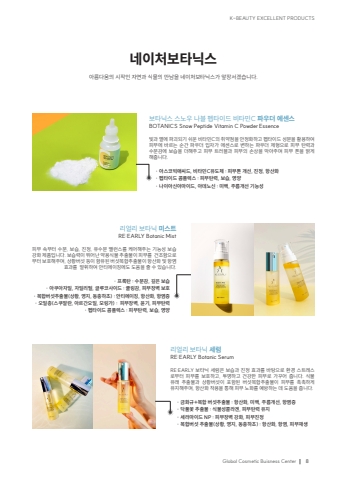 K-BEAUTY EXCELLENT PRODUCTSGlobal Cosmetic Buisness Center8%ub124%uc774%ucc98%ubcf4%ud0c0%ub2c9%uc2a4%uc544%ub984%ub2e4%uc6c0%uc758 %uc2dc%uc791%uc778 %uc790%uc5f0%uacfc %uc2dd%ubb3c%uc758 %ub9cc%ub0a8%uc744 %ub124%uc774%ucc98%ubcf4%ud0c0%ub2c9%uc2a4%uac00 %uc55e%uc7a5%uc11c%uaca0%uc2b5%ub2c8%ub2e4.%ub9ac%uc5bc%ub9ac %ubcf4%ud0c0%ub2c9 %uc138%ub7fcRE:EARLY Botanic SerumRE:EARLY %ubcf4%ud0c0%ub2c9 %uc138%ub7fc%uc740 %ubcf4%uc2b5%uacfc %uc9c4%uc815 %ud6a8%uacfc%ub97c %ubc14%ud0d5%uc73c%ub85c %ud658%uacbd %uc2a4%ud2b8%ub808%uc2a4 %ub85c%ubd80%ud130 %ud53c%ubd80%ub97c %ubcf4%ud638%ud558%uace0, %ud22c%uba85%ud558%uace0 %uac74%uac15%ud55c %ud53c%ubd80%ub85c %uac00%uafb8%uc5b4 %uc90d%ub2c8%ub2e4. %uc2dd%ubb3c %uc720%ub798 %ucd94%ucd9c%ubb3c%uacfc %uc0c1%ud669%ubc84%uc12f%uc774 %ud3ec%ud568%ub41c %ubc84%uc12f%ubcf5%ud569%ucd94%ucd9c%ubb3c%uc774 %ud53c%ubd80%ub97c %ucd09%ucd09%ud558%uac8c %uc720%uc9c0%ud574%uc8fc%uba70, %ud56d%uc0b0%ud654 %uc791%uc6a9%uc744 %ud1b5%ud574 %ud53c%ubd80 %ub178%ud654%ub97c %uc608%ubc29%ud558%ub294 %ub370 %ub3c4%uc6c0%uc744 %uc90d%ub2c8%ub2e4.%u00b7 %uae08%ud654%uaddc+%ubcf5%ud569 %ubc84%uc12f%ucd94%ucd9c%ubb3c : %ud56d%uc0b0%ud654, %ubbf8%ubc31, %uc8fc%ub984%uac1c%uc120, %ud56d%uc5fc%uc99d%u00b7 %ub2e5%ud480%uaf43 %ucd94%ucd9c%ubb3c : %uc2dd%ubb3c%uc131%ucf5c%ub77c%uac90, %ud53c%ubd80%ud0c4%ub825 %uc720%uc9c0%u00b7 %uc138%ub77c%ub9c8%uc774%ub4dc NP : %ud53c%ubd80%uc7a5%ubcbd %uac15%ud654, %ud53c%ubd80%uc9c4%uc815%u00b7 %ubcf5%ud569%ubc84%uc12f %ucd94%ucd9c%ubb3c(%uc0c1%ud669, %uc601%uc9c0, %ub3d9%ucda9%ud558%ucd08) : %ud56d%uc0b0%ud654, %ud56d%uc5fc, %ud53c%ubd80%uc7ac%uc0dd%ub9ac%uc5bc%ub9ac %ubcf4%ud0c0%ub2c9 %ubbf8%uc2a4%ud2b8RE:EARLY Botanic Mist %ud53c%ubd80 %uc18d%ubd80%ud130 %uc218%ubd84, %ubcf4%uc2b5, %uc9c4%uc815, %uc720%uc218%ubd84 %ubc38%ub7f0%uc2a4%ub97c %ucf00%uc5b4%ud574%uc8fc%ub294 %uae30%ub2a5%uc131 %ubcf4%uc2b5 %uac15%ud654 %uc81c%ud488%uc785%ub2c8%ub2e4. %ubcf4%uc2b5%ub825%uc774 %ub6f0%uc5b4%ub09c %uc57d%uc6a9%uc2dd%ubb3c %ucd94%ucd9c%ubb3c%uc774 %ud53c%ubd80%ub97c %uac74%uc870%ud568%uc73c%ub85c %ubd80%ud130 %ubcf4%ud638%ud574%uc8fc%uba70, %uc0c1%ud669%ubc84%uc12f %ub4f1%uc774 %ud568%uc720%ub41c %ubc84%uc12f%ubcf5%ud569%ucd94%ucd9c%ubb3c%uc774 %ud56d%uc0b0%ud654 %ubc0f %ud56d%uc5fc %ud6a8%uacfc%ub97c %ubc1c%ud718%ud558%uc5ec %uc548%ud2f0%uc5d0%uc774%uc9d5%uc5d0%ub3c4 %ub3c4%uc6c0%uc744 %uc904 %uc218 %uc788%uc2b5%ub2c8%ub2e4.%u00b7 %ud504%ub85d%ud0c4 : %uc218%ubd84%uac10, %uae4a%uc740 %ubcf4%uc2b5%u00b7 %uc544%ucfe0%uc544%uc790%uc77c, %uc790%uc77c%ub9ac%ud2f8, %uae00%ub8e8%ucf54%uc0ac%uc774%ub4dc : %ucfe8%ub9c1%uac10, %ud53c%ubd80%uc7a5%ubcbd %ubcf4%ud638%u00b7 %ubcf5%ud569%ubc84%uc12f%ucd94%ucd9c%ubb3c(%uc0c1%ud669, %uc601%uc9c0, %ub3d9%ucda9%ud558%ucd08) : %uc548%ud2f0%uc5d0%uc774%uc9d5, %ud56d%uc0b0%ud654, %ud56d%uc5fc%uc99d%u00b7 %uc624%uc77c%uce35(%uc2a4%ucfe0%uc54c%ub780, %uc544%ub974%uac04%uc624%uc77c, %ubaa8%ub9c1%uac00) : %ud53c%ubd80%uc7a5%ubcbd, %uc724%uae30, %ud53c%ubd80%ud0c4%ub825%u00b7 %ud3a9%ud0c0%uc774%ub4dc %ucf64%ud50c%ub809%uc2a4 : %ud53c%ubd80%ud0c4%ub825, %ubcf4%uc2b5, %uc601%uc591%ubcf4%ud0c0%ub2c9%uc2a4 %uc2a4%ub178%uc6b0 %ub098%ube14 %ud3a9%ud0c0%uc774%ub4dc %ube44%ud0c0%ubbfcC %ud30c%uc6b0%ub354 %uc5d0%uc13c%uc2a4 BOTANICS Snow Peptide Vitamin C Powder Essence%ube5b%uacfc %uc5f4%uc5d0 %ud30c%uad34%ub418%uae30 %uc26c%uc6b4 %ube44%ud0c0%ubbfcC%uc758 %ucde8%uc57d%uc810%uc744 %uc548%uc815%ud654%ud558%uace0 %ud3a9%ud0c0%uc774%ub4dc %uc131%ubd84%uc744 %ud65c%uc6a9%ud558%uc5ec %ud53c%ubd80%uc5d0 %ubc14%ub974%ub294 %uc21c%uac04 %ud30c%uc6b0%ub354 %uc785%uc790%uac00 %uc5d0%uc13c%uc2a4%ub85c %ubcc0%ud558%ub294 %ud30c%uc6b0%ub354 %uc81c%ud615%uc73c%ub85c %ud53c%ubd80 %ud0c4%ub825%uacfc %uc218%ubd84%uac10%uc5d0 %ubcf4%uc2b5%uc744 %ub354%ud574%uc8fc%uace0 %ud53c%ubd80 %ud2b8%ub7ec%ube14%uacfc %ud53c%ubd80%uc758 %uc190%uc0c1%uc744 %ub9c9%uc544%uc8fc%uba70 %ud53c%ubd80 %ud1a4%uc744 %ubc1d%uac8c %ud574%uc90d%ub2c8%ub2e4.%u00b7 %uc544%uc2a4%ucf54%ube45%uc560%uc528%ub4dc, %ube44%ud0c0%ubbfcC%uc720%ub3c4%uccb4 : %ud53c%ubd80%ud1a4 %uac1c%uc120, %uc9c4%uc815, %ud56d%uc0b0%ud654%u00b7 %ud3a9%ud0c0%uc774%ub4dc %ucf64%ud50c%ub809%uc2a4 : %ud53c%ubd80%ud0c4%ub825, %ubcf4%uc2b5, %uc601%uc591%u00b7 %ub098%uc774%uc544%uc2e0%uc544%ub9c8%uc774%ub4dc, %uc544%ub370%ub178%uc2e0 : %ubbf8%ubc31, %uc8fc%ub984%uac1c%uc120 %uae30%ub2a5%uc131
