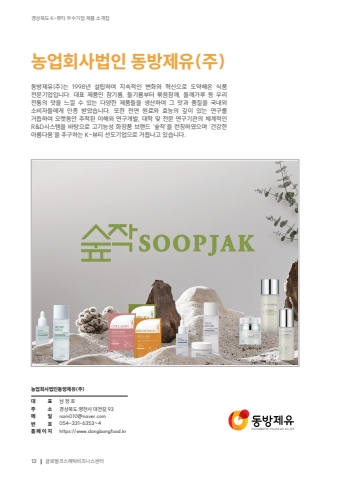13%uacbd%uc0c1%ubd81%ub3c4 K-%ubdf0%ud2f0 %uc6b0%uc218%uae30%uc5c5 %uc81c%ud488 %uc18c%uac1c%uc9d1%uae00%ub85c%ubc8c%ucf54%uc2a4%uba54%ud2f1%ube44%uc988%ub2c8%uc2a4%uc13c%ud130%ub18d%uc5c5%ud68c%uc0ac%ubc95%uc778 %ub3d9%ubc29%uc81c%uc720(%uc8fc)%ub300 %ud45c%uc8fc %uc18c%uba54 %uc77c%ubc88 %ud638%ud648%ud398%uc774%uc9c0%ub0a8 %uc815 %ud638%uacbd%uc0c1%ubd81%ub3c4 %uc601%ucc9c%uc2dc %ub300%uc804%uae38 93nam010@naver.com054-331-6353~4https://www.dongbangfood.kr%ub18d%uc5c5%ud68c%uc0ac%ubc95%uc778%ub3d9%ubc29%uc81c%uc720(%uc8fc)%ub3d9%ubc29%uc81c%uc720(%uc8fc)%ub294 1998%ub144 %uc124%ub9bd%ud558%uc5ec %uc9c0%uc18d%uc801%uc778 %ubcc0%ud654%uc640 %ud601%uc2e0%uc73c%ub85c %ub3c4%uc57d%ud574%uc628 %uc2dd%ud488 %uc804%ubb38%uae30%uc5c5%uc785%ub2c8%ub2e4. %ub300%ud45c %uc81c%ud488%uc778 %ucc38%uae30%ub984, %ub4e4%uae30%ub984%ubd80%ud130 %ubcf6%uc74c%ucc38%uae68, %ub4e4%uae68%uac00%ub8e8 %ub4f1 %uc6b0%ub9ac %uc804%ud1b5%uc758 %ub9db%uc744 %ub290%ub084 %uc218 %uc788%ub294 %ub2e4%uc591%ud55c %uc81c%ud488%ub4e4%uc744 %uc0dd%uc0b0%ud558%uc5ec %uadf8 %ub9db%uacfc %ud488%uc9c8%uc744 %uad6d%ub0b4%uc678 %uc18c%ube44%uc790%ub4e4%uc5d0%uac8c %uc778%uc99d %ubc1b%uc558%uc2b5%ub2c8%ub2e4. %ub610%ud55c %ucc9c%uc5f0 %uc6d0%ub8cc%uc640 %ud6a8%ub2a5%uc758 %uae4a%uc774 %uc788%ub294 %uc5f0%uad6c%ub97c %uac70%ub4ed%ud558%uc5ec %uc624%ub7ab%ub3d9%uc548 %ucd94%ucc99%ub41c %uc774%ud574%uc640 %uc5f0%uad6c%uac1c%ubc1c, %ub300%ud559 %ubc0f %uc804%ubb38 %uc5f0%uad6c%uae30%uad00%uc758 %uccb4%uacc4%uc801%uc778 R&D%uc2dc%uc2a4%ud15c%uc744 %ubc14%ud0d5%uc73c%ub85c %uace0%uae30%ub2a5%uc131 %ud654%uc7a5%ud488 %ube0c%ub79c%ub4dc %u2018%uc232%uc791%u2019%uc744 %ub7f0%uce6d%ud558%uc600%uc73c%uba70 %u2018%uac74%uac15%ud55c %uc544%ub984%ub2e4%uc6c0%u2019%uc744 %ucd94%uad6c%ud558%ub294 K-%ubdf0%ud2f0 %uc120%ub3c4%uae30%uc5c5%uc73c%ub85c %uac70%ub4ed%ub098%uace0 %uc788%uc2b5%ub2c8%ub2e4.