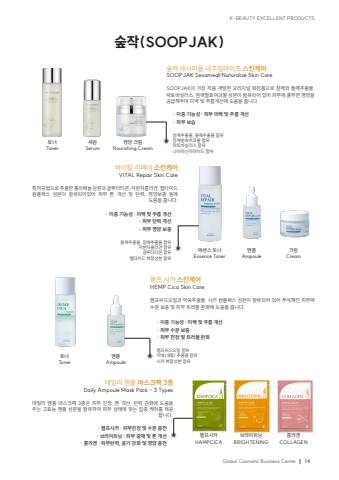 K-BEAUTY EXCELLENT PRODUCTSGlobal Cosmetic Buisness Center14%uc232%uc791(SOOPJAK)%ud1a0%ub108Toner%uc138%ub7fcSerum%uc601%uc591 %ud06c%ub9bcNourishing Cream%uc232%uc791 %uc138%uc0ac%ubbf8%uc62c %ub124%ucd94%ub7f4%ub77c%uc774%uc988 %uc2a4%ud0a8%ucf00%uc5b4SOOPJAK Sesameall Naturalize Skin CareSOOPJAK%uc774 %uac00%uc7a5 %ucc98%uc74c %uac1c%ubc1c%ud55c %uc624%ub9ac%uc9c0%ub110 %ud654%uc7a5%ud488%uc73c%ub85c %ucc38%uae68%uc640 %ub4e4%uae68%ucd94%ucd9c%ubb3c, %ub77d%ud1a0%ubc14%uc2e4%ub7ec%uc2a4, %ucc38%uae68%ubc1c%ud6a8%uc5ec%uacfc%ubb3c %uc131%ubd84%uc774 %ud568%uc720%ub418%uc5b4 %uc788%uc5b4 %ud53c%ubd80%uc5d0 %ud48d%ubd80%ud55c %uc601%uc591%uc744 %uacf5%uae09%ud574%uc8fc%uba70 %ubbf8%ubc31 %ubc0f %uc8fc%ub984%uac1c%uc120%uc5d0 %ub3c4%uc6c0%uc744 %uc90d%ub2c8%ub2e4.%u00b7 %uc774%uc911 %uae30%ub2a5%uc131 : %ud53c%ubd80 %ubbf8%ubc31 %ubc0f %uc8fc%ub984 %uac1c%uc120%u00b7 %ud53c%ubd80 %ubcf4%uc2b5%ucc38%uae68%ucd94%ucd9c%ubb3c, %ub4e4%uae68%ucd94%ucd9c%ubb3c %ud568%uc720%ucc38%uae68%ubc1c%ud6a8%uc5ec%uacfc%ubb3c %ud568%uc720%ub77d%ud1a0%ubc14%uc2e4%ub7ec%uc2a4 %ud568%uc720%ub098%uc774%uc544%uc2e0%uc544%ub9c8%uc774%ub4dc %ud568%uc720%uc5d0%uc13c%uc2a4 %ud1a0%ub108Essence Toner%uc570%ud50cAmpoule%ud06c%ub9bcCream%ubc14%uc774%ud0c8 %ub9ac%ud398%uc5b4 %uc2a4%ud0a8%ucf00%uc5b4VITAL Repair Skin Care%ud2b9%ud5c8%uacf5%ubc95%uc73c%ub85c %ucd94%ucd9c%ud55c %ud3f4%ub9ac%ud398%ub180 %uc131%ubd84%uacfc %uae00%ub8e8%ud0c0%ud2f0%uc628, %uc800%ubd84%uc790%ucf5c%ub77c%uac90, %ud3a9%ud0c0%uc774%ub4dc%ucef4%ud50c%ub809%uc2a4 %uc131%ubd84%uc774 %ud568%uc720%ub418%uc5b4%uc788%uc5b4 %ud53c%ubd80 %ud1a4 %uac1c%uc120 %ubc0f %ud0c4%ub825, %uc601%uc591%ubcf4%ucda9 %ub4f1%uc5d0 %ub3c4%uc6c0%uc744 %uc90d%ub2c8%ub2e4.%u00b7 %uc774%uc911 %uae30%ub2a5%uc131 : %ubbf8%ubc31 %ubc0f %uc8fc%ub984 %uac1c%uc120%u00b7 %ud53c%ubd80 %ud0c4%ub825 %uac1c%uc120%u00b7 %ud53c%ubd80 %uc601%uc591 %ubcf4%ucda9%ub4e4%uae68%ucd94%ucd9c%ubb3c, %ucc38%uae68%ucd94%ucd9c%ubb3c %ud568%uc720%uc800%ubd84%uc790%ucf5c%ub77c%uac90 %ud568%uc720%uae00%ub8e8%ud0c0%ud2f0%uc628 %ud568%uc720%ud3a9%ud0c0%uc774%ub4dc %ubcf5%ud569%uc131%ubd84 %ud568%uc720%ud1a0%ub108Toner%uc570%ud50cAmpoule%ud584%ud504 %uc2dc%uce74 %uc2a4%ud0a8%ucf00%uc5b4HEMP Cica Skin Care%ud584%ud504%uc528%ub4dc%uc624%uc77c%uacfc %uc57d%uc465%ucd94%ucd9c%ubb3c, %uc2dc%uce74 %ucef4%ud50c%ub809%uc2a4 %uc131%ubd84%uc774 %ud568%uc720%ub418%uc5b4 %uc788%uc5b4 %ud478%uc11d%ud574%uc9c4 %ud53c%ubd80%uc5d0 %uc218%ubd84 %ubcf4%ucda9 %ubc0f %ud53c%ubd80 %ud2b8%ub7ec%ube14 %uc644%ud654%uc5d0 %ub3c4%uc6c0%uc744 %uc90d%ub2c8%ub2e4.%u00b7 %uc774%uc911 %uae30%ub2a5%uc131 : %ubbf8%ubc31 %ubc0f %uc8fc%ub984 %uac1c%uc120%u00b7 %ud53c%ubd80 %uc218%ubd84 %ubcf4%ucda9%u00b7 %ud53c%ubd80 %uc9c4%uc815 %ubc0f %ud2b8%ub7ec%ube14 %uc644%ud654%ud584%ud504%uc528%ub4dc%uc624%uc77c %ud568%uc720%uc57d%uc465(%uac1c%ub625) %ucd94%ucd9c%ubb3c %ud568%uc720%uc2dc%uce74 %ubcf5%ud569%uc131%ubd84 %ud568%uc720%ud584%ud504%uc2dc%uce74HAMPCICA%ube0c%ub77c%uc774%ud2b8%ub2ddBRIGHTENING%ucf5c%ub77c%uac90COLLAGEN%ub370%uc77c%ub9ac %uc570%ud50c %ub9c8%uc2a4%ud06c%ud329 3%uc885Daily Ampoule Mask Pack - 3 Types%ub370%uc77c%ub9ac %uc570%ud50c %ub9c8%uc2a4%ud06c%ud329 3%uc885%uc740 %ud53c%ubd80 %uc9c4%uc815, %ud1a4 %uac1c%uc120, %ud0c4%ub825 %uac15%ud654%uc5d0 %ub3c4%uc6c0%uc744 %uc8fc%ub294 %uace0%ud6a8%ub2a5 %uc570%ud50c %uc131%ubd84%uc744 %ud568%uc720%ud558%uc5ec %ud53c%ubd80 %uc0c1%ud0dc%uc5d0 %ub9de%ub294 %uc9d1%uc911 %ucf00%uc5b4%ub97c %uc81c%uacf5%ud569%ub2c8%ub2e4.%u00b7 %ud584%ud504%uc2dc%uce74 : %ud53c%ubd80%uc9c4%uc815 %ubc0f %uc218%ubd84 %ucda9%uc804%u00b7 %ube0c%ub77c%uc774%ud2b8%ub2dd : %ud53c%ubd80 %uad11%ucc44 %ubc0f %ud1a4 %uac1c%uc120%u00b7 %ucf5c%ub77c%uac90 : %ud53c%ubd80%ud0c4%ub825, %uc724%uae30 %uac15%ud654 %ubc0f %uc601%uc591 %ucda9%uc804