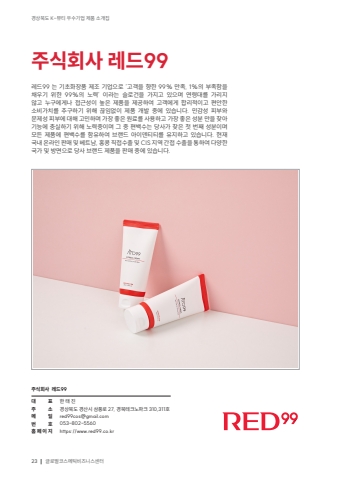 23%uacbd%uc0c1%ubd81%ub3c4 K-%ubdf0%ud2f0 %uc6b0%uc218%uae30%uc5c5 %uc81c%ud488 %uc18c%uac1c%uc9d1%uae00%ub85c%ubc8c%ucf54%uc2a4%uba54%ud2f1%ube44%uc988%ub2c8%uc2a4%uc13c%ud130%uc8fc%uc2dd%ud68c%uc0ac %ub808%ub4dc99%ub300 %ud45c%uc8fc %uc18c%uba54 %uc77c%ubc88 %ud638%ud648%ud398%uc774%uc9c0%ud55c %ud0dc %uc9c4%uacbd%uc0c1%ubd81%ub3c4 %uacbd%uc0b0%uc2dc %uc0bc%ud48d%ub85c 27, %uacbd%ubd81%ud14c%ud06c%ub178%ud30c%ud06c 310,311%ud638red99cos@gmail.com053-802-5560https://www.red99.co.kr%uc8fc%uc2dd%ud68c%uc0ac %ub808%ub4dc99%ub808%ub4dc99 %ub294 %uae30%ucd08%ud654%uc7a5%ud488 %uc81c%uc870 %uae30%uc5c5%uc73c%ub85c %u2018%uace0%uac1d%uc744 %ud5a5%ud55c 99% %ub9cc%uc871, 1%%uc758 %ubd80%uc871%ud568%uc744 %ucc44%uc6b0%uae30 %uc704%ud55c 99%%uc758 %ub178%ub825%u2019 %uc774%ub77c%ub294 %uc2ac%ub85c%uac74%uc744 %uac00%uc9c0%uace0 %uc788%uc73c%uba70 %uc5f0%ub839%ub300%ub97c %uac00%ub9ac%uc9c0 %uc54a%uace0 %ub204%uad6c%uc5d0%uac8c%ub098 %uc811%uadfc%uc131%uc774 %ub192%uc740 %uc81c%ud488%uc744 %uc81c%uacf5%ud558%uc5ec %uace0%uac1d%uc5d0%uac8c %ud569%ub9ac%uc801%uc774%uace0 %ud3b8%uc548%ud55c %uc18c%ube44%uac00%uce58%ub97c %ucd94%uad6c%ud558%uae30 %uc704%ud574 %ub04a%uc784%uc5c6%uc774 %uc81c%ud488 %uac1c%ubc1c %uc911%uc5d0 %uc788%uc2b5%ub2c8%ub2e4. %ubbfc%uac10%uc131 %ud53c%ubd80%uc640 %ubb38%uc81c%uc131 %ud53c%ubd80%uc5d0 %ub300%ud574 %uace0%ubbfc%ud558%uba70 %uac00%uc7a5 %uc88b%uc740 %uc6d0%ub8cc%ub97c %uc0ac%uc6a9%ud558%uace0 %uac00%uc7a5 %uc88b%uc740 %uc131%ubd84 %ub9cc%uc744 %ucc3e%uc544 %uae30%ub2a5%uc5d0 %ucda9%uc2e4%ud558%uae30 %uc704%ud574 %ub178%ub825%uc911%uc774%uba70 %uadf8 %uc911 %ud3b8%ubc31%uc218%ub294 %ub2f9%uc0ac%uac00 %ucc3e%uc740 %uccab %ubc88%uc9f8 %uc131%ubd84%uc774%uba70 %ubaa8%ub4e0 %uc81c%ud488%uc5d0 %ud3b8%ubc31%uc218%ub97c %ud568%uc720%ud558%uc5ec %ube0c%ub79c%ub4dc %uc544%uc774%ub374%ud2f0%ud2f0%ub97c %uc720%uc9c0%ud558%uace0 %uc788%uc2b5%ub2c8%ub2e4. %ud604%uc7ac %uad6d%ub0b4 %uc628%ub77c%uc778 %ud310%ub9e4 %ubc0f %ubca0%ud2b8%ub0a8, %ud64d%ucf69 %uc9c1%uc811%uc218%ucd9c %ubc0f CIS %uc9c0%uc5ed %uac04%uc811 %uc218%ucd9c%uc744 %ud1b5%ud558%uc5ec %ub2e4%uc591%ud55c %uad6d%uac00 %ubc0f %ubc29%uba74%uc73c%ub85c %ub2f9%uc0ac %ube0c%ub79c%ub4dc %uc81c%ud488%uc744 %ud310%ub9e4 %uc911%uc5d0 %uc788%uc2b5%ub2c8%ub2e4.