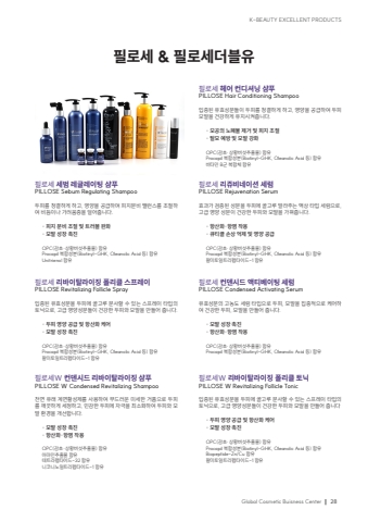 K-BEAUTY EXCELLENT PRODUCTSGlobal Cosmetic Buisness Center28%ud544%ub85c%uc138 & %ud544%ub85c%uc138%ub354%ube14%uc720%ud544%ub85c%uc138 %ud5e4%uc5b4 %ucee8%ub514%uc154%ub2dd %uc0f4%ud478PILLOSE Hair Conditioning Shampoo%uc785%uc99d%ub41c %uc720%ud6a8%uc131%ubd84%ub4e4%uc774 %ub450%ud53c%ub97c %uccad%uacb0%ud558%uac8c %ud558%uace0, %uc601%uc591%uc744 %uacf5%uae09%ud558%uc5ec %ub450%ud53c %ubaa8%ubc1c%uc744 %uac74%uac15%ud558%uac8c %uc720%uc9c0%uc2dc%ucf1c%uc90d%ub2c8%ub2e4.%u00b7 %ubaa8%uacf5%uc758 %ub178%ud3d0%ubb3c %uc81c%uac70 %ubc0f %ud53c%uc9c0 %uc870%uc808%u00b7 %ud0c8%ubaa8 %uc608%ubc29 %ubc0f %ubaa8%ubc1c %uac15%ud654OPC(%uac10%ucd08%u00b7%uc0c1%ud669%ubc84%uc12f%ucd94%ucd9c%ubb3c) %ud568%uc720Procapil %ubcf5%ud569%uc131%ubd84(Biotinyl-GHK, Oleanolic Acid %ub4f1) %ud568%uc720%ube44%ud0c0%ubbfc B%uad70 %ubcf5%ud569%uccb4 %ud568%uc720%ud544%ub85c%uc138 %ucee8%ub374%uc2dc%ub4dc %uc561%ud2f0%ubca0%uc774%ud305 %uc138%ub7fcPILLOSE Condensed Activating Serum%uc720%ud6a8%uc131%ubd84%uc758 %uace0%ub18d%ub3c4 %uc138%ub7fc %ud0c0%uc785%uc73c%ub85c %ub450%ud53c, %ubaa8%ubc1c%uc744 %uc9d1%uc911%uc801%uc73c%ub85c %ucf00%uc5b4%ud558%uc5ec %uac74%uac15%ud55c %ub450%ud53c, %ubaa8%ubc1c%uc744 %ub9cc%ub4e4%uc5b4 %uc90d%ub2c8%ub2e4.%u00b7 %ubaa8%ubc1c %uc131%uc7a5 %ucd09%uc9c4%u00b7 %ud56d%uc0b0%ud654%u00b7%ud56d%uc5fc %uc791%uc6a9OPC(%uac10%ucd08%u00b7%uc0c1%ud669%ubc84%uc12f%ucd94%ucd9c%ubb3c) %ud568%uc720Procapil %ubcf5%ud569%uc131%ubd84(Biotinyl-GHK, Oleanolic Acid %ub4f1) %ud568%uc720%ud544%ub85c%uc138 %ub9ac%ubc14%uc774%ud0c8%ub77c%uc774%uc9d5 %ud3f4%ub9ac%ud074 %uc2a4%ud504%ub808%uc774PILLOSE Revitalizing Follicle Spray%uc785%uc99d%ub41c %uc720%ud6a8%uc131%ubd84%uc744 %ub450%ud53c%uc5d0 %uace8%uace0%ub8e8 %ubd84%uc0ac%ud560 %uc218 %uc788%ub294 %uc2a4%ud504%ub808%uc774 %ud0c0%uc785%uc758 %ud1a0%ub2c9%uc73c%ub85c, %uace0%uae09 %uc601%uc591%uc131%ubd84%ub4e4%uc774 %uac74%uac15%ud55c %ub450%ud53c%uc640 %ubaa8%ubc1c%uc744 %ub9cc%ub4e4%uc5b4 %uc90d%ub2c8%ub2e4.%u00b7 %ub450%ud53c %uc601%uc591 %uacf5%uae09 %ubc0f %ud56d%uc0b0%ud654 %ucf00%uc5b4%u00b7 %ubaa8%ubc1c %uc131%uc7a5 %ucd09%uc9c4OPC(%uac10%ucd08%u00b7%uc0c1%ud669%ubc84%uc12f%ucd94%ucd9c%ubb3c) %ud568%uc720Procapil %ubcf5%ud569%uc131%ubd84(Biotinyl-GHK, Oleanolic Acid %ub4f1) %ud568%uc720%ud314%ubbf8%ud1a0%uc77c%ud2b8%ub9ac%ud3a9%ud0c0%uc774%ub4dc-1 %ud568%uc720%ud544%ub85c%uc138 %uc138%ubc94 %ub808%uade4%ub808%uc774%ud305 %uc0f4%ud478PILLOSE Sebum Regulating Shampoo%ub450%ud53c%ub97c %uccad%uacb0%ud558%uac8c %ud558%uace0, %uc601%uc591%uc744 %uacf5%uae09%ud558%uba70 %ud53c%uc9c0%ubd84%ube44 %ubc38%ub7f0%uc2a4%ub97c %uc870%uc808%ud558%uc5ec %ube44%ub4ec%uc774%ub098 %uac00%ub824%uc6c0%uc99d%uc744 %ub35c%uc5b4%uc90d%ub2c8%ub2e4.%u00b7 %ud53c%uc9c0 %ubd84%ube44 %uc870%uc808 %ubc0f %ud2b8%ub7ec%ube14 %uc644%ud654%u00b7 %ubaa8%ubc1c %uc131%uc7a5 %ucd09%uc9c4OPC(%uac10%ucd08%u00b7%uc0c1%ud669%ubc84%uc12f%ucd94%ucd9c%ubb3c) %ud568%uc720Procapil %ubcf5%ud569%uc131%ubd84(Biotinyl-GHK, Oleanolic Acid %ub4f1) %ud568%uc720Unitrienol %ud568%uc720%ud544%ub85c%uc138 %ub9ac%uc96c%ube44%ub124%uc774%uc158 %uc138%ub7fcPILLOSE Rejuvenation Serum%ud6a8%uacfc%uac00 %uac80%uc99d%ub41c %uc131%ubd84%uc744 %ub450%ud53c%uc5d0 %uace8%uace0%ub8e8 %ubc1c%ub77c%uc8fc%ub294 %uc561%uc0c1 %ud0c0%uc785 %uc138%ub7fc%uc73c%ub85c, %uace0%uae09 %uc601%uc591 %uc131%ubd84%uc774 %uac74%uac15%ud55c %ub450%ud53c%uc640 %ubaa8%ubc1c%uc744 %uac00%uafd4%uc90d%ub2c8%ub2e4.%u00b7 %ud56d%uc0b0%ud654%u00b7%ud56d%uc5fc %uc791%uc6a9%u00b7 %ud050%ud2f0%ud074 %uc190%uc0c1 %uc5b5%uc81c %ubc0f %uc601%uc591 %uacf5%uae09OPC(%uac10%ucd08%u00b7%uc0c1%ud669%ubc84%uc12f%ucd94%ucd9c%ubb3c) %ud568%uc720Procapil %ubcf5%ud569%uc131%ubd84(Biotinyl-GHK, Oleanolic Acid %ub4f1) %ud568%uc720%ud314%ubbf8%ud1a0%uc77c%ud2b8%ub9ac%ud3a9%ud0c0%uc774%ub4dc-1 %ud568%uc720%ud544%ub85c%uc138W %ucee8%ub374%uc2dc%ub4dc %ub9ac%ubc14%uc774%ud0c8%ub77c%uc774%uc9d5 %uc0f4%ud478PILLOSE W Condensed Revitalizing Shampoo%ucc9c%uc5f0 %uc720%ub798 %uacc4%uba74%ud65c%uc131%uc81c%ub97c %uc0ac%uc6a9%ud558%uc5ec %ubd80%ub4dc%ub7ec%uc6b4 %ubbf8%uc138%ud55c %uac70%ud488%uc73c%ub85c %ub450%ud53c%ub97c %uae68%ub057%ud558%uac8c %uc138%uc815%ud558%uace0, %ubbfc%uac10%ud55c %ub450%ud53c%uc5d0 %uc790%uadf9%uc744 %ucd5c%uc18c%ud654%ud558%uc5ec %ub450%ud53c%uc640 %ubaa8%ubc1c %ud658%uacbd%uc744 %uac1c%uc120%ud569%ub2c8%ub2e4. %u00b7 %ubaa8%ubc1c %uc131%uc7a5 %ucd09%uc9c4%u00b7 %ud56d%uc0b0%ud654%u00b7%ud56d%uc5fc %uc791%uc6a9OPC(%uac10%ucd08%u00b7%uc0c1%ud669%ubc84%uc12f%ucd94%ucd9c%ubb3c) %ud568%uc720%uc544%ub9c8%uc778%ucd94%ucd9c%ubb3c %ud568%uc720%ud14c%ud2b8%ub77c%ud3a9%ud0c0%uc774%ub4dc-32 %ud568%uc720%ub2c8%ucf54%ub2c8%ub178%uc77c%ud2b8%ub9ac%ud3a9%ud0c0%uc774%ub4dc-1 %ud568%uc720%ud544%ub85c%uc138W %ub9ac%ubc14%uc774%ud0c8%ub77c%uc774%uc9d5 %ud3f4%ub9ac%ud074 %ud1a0%ub2c9PILLOSE W Revitalizing Follicle Tonic%uc785%uc99d%ub41c %uc720%ud6a8%uc131%ubd84%uc744 %ub450%ud53c%uc5d0 %uace8%uace0%ub8e8 %ubd84%uc0ac%ud560 %uc218 %uc788%ub294 %uc2a4%ud504%ub808%uc774 %ud0c0%uc785%uc758 %ud1a0%ub2c9%uc73c%ub85c, %uace0%uae09 %uc601%uc591%uc131%ubd84%ub4e4%uc774 %uac74%uac15%ud55c %ub450%ud53c%uc640 %ubaa8%ubc1c%uc744 %ub9cc%ub4e4%uc5b4 %uc90d%ub2c8%ub2e4%u00b7 %ub450%ud53c %uc601%uc591 %uacf5%uae09 %ubc0f %ud56d%uc0b0%ud654 %ucf00%uc5b4%u00b7 %ubaa8%ubc1c %uc131%uc7a5 %ucd09%uc9c4OPC(%uac10%ucd08%u00b7%uc0c1%ud669%ubc84%uc12f%ucd94%ucd9c%ubb3c) %ud568%uc720Procapil %ubcf5%ud569%uc131%ubd84(Biotinyl-GHK, Oleanolic Acid %ub4f1) %ud568%uc720Biopeptide-Zn/Cu %ud568%uc720%ud314%ubbf8%ud1a0%uc77c%ud2b8%ub9ac%ud3a9%ud0c0%uc774%ub4dc-1 %ud568%uc720