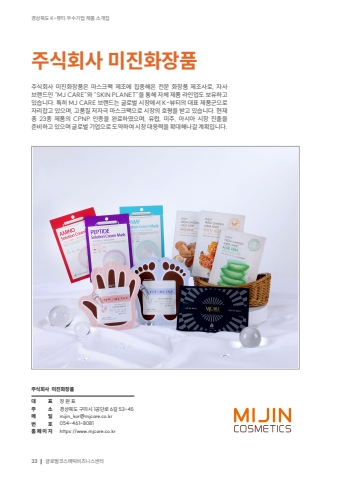 33%uacbd%uc0c1%ubd81%ub3c4 K-%ubdf0%ud2f0 %uc6b0%uc218%uae30%uc5c5 %uc81c%ud488 %uc18c%uac1c%uc9d1%uae00%ub85c%ubc8c%ucf54%uc2a4%uba54%ud2f1%ube44%uc988%ub2c8%uc2a4%uc13c%ud130%uc8fc%uc2dd%ud68c%uc0ac %ubbf8%uc9c4%ud654%uc7a5%ud488%ub300 %ud45c%uc8fc %uc18c%uba54 %uc77c%ubc88 %ud638%ud648%ud398%uc774%uc9c0%uc7a5 %uc6d0 %ud45c%uacbd%uc0c1%ubd81%ub3c4 %uad6c%ubbf8%uc2dc 1%uacf5%ub2e8%ub85c 6%uae38 53-45mijin_kor@mjcare.co.kr054-461-8081https://www.mjcare.co.kr%uc8fc%uc2dd%ud68c%uc0ac %ubbf8%uc9c4%ud654%uc7a5%ud488%uc8fc%uc2dd%ud68c%uc0ac %ubbf8%uc9c4%ud654%uc7a5%ud488%uc740 %ub9c8%uc2a4%ud06c%ud329 %uc81c%uc870%uc5d0 %uc9d1%uc911%ud574%uc628 %uc804%ubb38 %ud654%uc7a5%ud488 %uc81c%uc870%uc0ac%ub85c, %uc790%uc0ac %ube0c%ub79c%ub4dc%uc778 %u201cMJ CARE%u201d%uc640 %u201cSKIN PLANET%u201d%uc744 %ud1b5%ud574 %uc790%uccb4 %uc81c%ud488 %ub77c%uc778%uc5c5%ub3c4 %ubcf4%uc720%ud558%uace0 %uc788%uc2b5%ub2c8%ub2e4. %ud2b9%ud788 MJ CARE %ube0c%ub79c%ub4dc%ub294 %uae00%ub85c%ubc8c %uc2dc%uc7a5%uc5d0%uc11c K-%ubdf0%ud2f0%uc758 %ub300%ud45c %uc81c%ud488%uad70%uc73c%ub85c %uc790%ub9ac%uc7a1%uace0 %uc788%uc73c%uba70, %uace0%ud488%uc9c8 %uc800%uc790%uadf9 %ub9c8%uc2a4%ud06c%ud329%uc73c%ub85c %uc2dc%uc7a5%uc758 %ud638%ud3c9%uc744 %ubc1b%uace0 %uc788%uc2b5%ub2c8%ub2e4. %ud604%uc7ac %ucd1d 23%uc885 %uc81c%ud488%uc758 CPNP %uc778%uc99d%uc744 %uc644%ub8cc%ud558%uc600%uc73c%uba70, %uc720%ub7fd, %ubbf8%uc8fc, %uc544%uc2dc%uc544 %uc2dc%uc7a5 %uc9c4%ucd9c%uc744 %uc900%ube44%ud558%uace0 %uc788%uc73c%uba70 %uae00%ub85c%ubc8c %uae30%uc5c5%uc73c%ub85c %ub3c4%uc57d%ud558%uc5ec %uc2dc%uc7a5 %ub300%uc751%ub825%uc744 %ud655%ub300%ud574%ub098%uac08 %uacc4%ud68d%uc785%ub2c8%ub2e4.