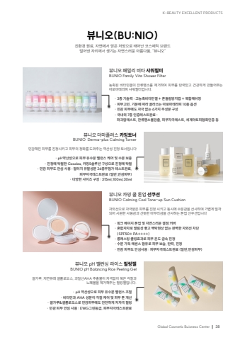 K-BEAUTY EXCELLENT PRODUCTSGlobal Cosmetic Buisness Center38%ubdf0%ub2c8%uc624(BU:NIO)%uce5c%ud658%uacbd %uc6d0%ub8cc, %uc790%uc5f0%uc5d0%uc11c %uc5bb%uc740 %ucc98%ubc29%uc73c%ub85c %ud0dc%uc5b4%ub09c %ucf54%uc2a4%uba54%ud2f1 %ube0c%ub79c%ub4dc%ub35c%uc5b4%ub0b8 %uc790%ub9ac%uc5d0%uc11c %uc0dd%uae30%ub294 %uc790%uc5f0%uc2a4%ub7ec%uc6b4 %uc544%ub984%ub2e4%uc6c0, %u201c%ubdf0%ub2c8%uc624%u201d%ubdf0%ub2c8%uc624 %ud328%ubc00%ub9ac %ube44%ud0c0 %uc0e4%uc6cc%ud544%ud130BUNIO Family Vita Shower Filter%ub18d%ucd95%ub41c %ube44%ud0c0%ubbfc%uac94%uc774 %uc794%ub958%uc5fc%uc18c%ub97c %uc81c%uac70%ud558%uc5ec %ud53c%ubd80%ub97c %ud0c4%ub825%uc788%uace0 %uac74%uac15%ud558%uac8c %ub9cc%ub4e4%uc5b4%uc8fc%ub294 %uc544%ub85c%ub9c8%ud14c%ub77c%ud53c %uc0e4%uc6cc%ud544%ud130%uc785%ub2c8%ub2e4. %u00b7 3%uc911 %uae30%uc220%ub825 : %uace0%ub18d%ucd95%ube44%ud0c0%ubbfc%uac94 + %ud754%ub4e4%ub9bc%ubc29%uc9c0%ucea1 + %ubcf5%ud569%uba54%uc26c%ub9dd %u00b7 %ud53c%ubd80%uace0%ubbfc, %uae30%ubd84%uc5d0 %ub530%ub77c %uace8%ub77c%uc4f0%ub294 %uc544%ub85c%ub9c8%ud14c%ub77c%ud53c 10%uc885 %uc635%uc158 %u00b7 %ubbfc%uac10 %ud53c%ubd80%uc5d0%ub3c4 %uc790%uadf9 %uc5c6%ub294 6%uac00%uc9c0 %uc8fc%uc131%ubd84 %uad6c%uc131 %u00b7 %uad6d%ub0b4%uc678 7%uc885 %uc778%uc99d%ud14c%uc2a4%ud2b8%uc644%ub8cc : %ud30c%uad34%uc555%ud14c%uc2a4%ud2b8, %uc794%ub958%uc5fc%uc18c%ubd88%uac80%ucd9c, %ud53c%ubd80%uc790%uadf9%ud14c%uc2a4%ud2b8, %uc138%uacc4%uc544%ud1a0%ud53c%ud611%ud68c%uc778%uc99d %ub4f1%ubdf0%ub2c8%uc624 %uce74%ubc0d %ucfe8 %ud1a4%uc5c5 %uc120%ucfe0%uc158BUNIO Calming Cool Tone-up Sun Cushion%uc790%uc678%uc120%uc73c%ub85c %uc790%uadf9%ubc1b%uc740 %ud53c%ubd80%ub97c %uc9c4%uc815 %uc2dc%ud0a4%uace0 %ub3d9%uc2dc%uc5d0 %uc218%ubd84%uac10%uc744 %uc120%uc0ac%ud558%uba70 %uac00%ubccd%uac8c %ubc00%ucc29%ub418%uc5b4 %uc2dc%uc6d0%ud55c %uc0ac%uc6a9%uac10%uacfc %uc0b0%ub73b%ud55c %ub9c8%ubb34%ub9ac%uac10%uc744 %uc120%uc0ac%ud558%ub294 %ud1a4%uc5c5 %uc120%ucfe0%uc158%uc785%ub2c8%ub2e4 %u00b7 %ud551%ud06c %ubca0%uc774%uc9c0 %ud1a4%uc5c5 %ubc0f %uc790%uc5f0%uc2a4%ub7ec%uc6b4 %uacb0%uc810 %ucee4%ubc84 %u00b7 %ud63c%ud569%uc790%ucc28%ub85c %ubc1c%ub9bc%uc131 %uc88b%uace0 %ubc31%ud0c1%ud604%uc0c1 %uc5c6%ub294 %uc644%ubcbd%ud55c %uc790%uc678%uc120 %ucc28%ub2e8 (SPF50+ PA++++) %u00b7 %ub871%ub798%uc2a4%ud305 %ucfe8%ub9c1%ud6a8%uacfc%ub85c %ud53c%ubd80 %uc628%ub3c4 %uae09%uc18d %uc9c4%uc815 %u00b7 %uc218%ubd84 %uac00%ub4dd %uc5d0%uc13c%uc2a4 %ud568%uc720%ub85c %ud53c%ubd80 %ubcf4%uc2b5, %ud0c4%ub825, %uc9c4%uc815 %u00b7 %ubbfc%uac10 %ud53c%ubd80%ub3c4 %uc548%uc2ec%uc0ac%uc6a9 : %ud53c%ubd80%uc790%uadf9%ud14c%uc2a4%ud2b8%uc644%ub8cc (%uc77c%ubc18,%ubbfc%uac10%ud53c%ubd80)%ubdf0%ub2c8%uc624 %ub354%ub9c8%ud50c%ub7ec%uc2a4 %uce74%ubc0d%ud1a0%ub108BUNIO Derma-plus Calming Torner%ubbfc%uac10%ud574%uc9c4 %ud53c%ubd80%ub97c %uc9c4%uc815%uc2dc%ud0a4%uace0 %ud53c%ubd80%uc758 %uc815%ud654%ub97c %ub3c4%uc640%uc8fc%ub294 %uc57d%uc0b0%uc131 %uc9c4%uc815 %ud1a0%ub108%uc785%ub2c8%ub2e4 %u00b7 pH%uc57d%uc0b0%uc131%uc73c%ub85c %ud53c%ubd80 %uc720%uc218%ubd84 %ubc38%ub7f0%uc2a4 %ucf00%uc5b4 %ubc0f %uc218%ubd84 %ubcf4%ucda9 %u00b7 %uc9c4%uc815%uc5d0 %ud0c1%uc6d4%ud55c Gesolza, %uce74%ubc0d5%uc194%ub8e8%uc158 %uad6c%uc131%uc73c%ub85c %uc9c4%uc815%uc5d0 %ud0c1%uc6d4 %u00b7 %ubbfc%uac10 %ud53c%ubd80%ub3c4 %uc548%uc2ec %uc0ac%uc6a9 : %uc54c%ub7ec%uc9c0 %uc720%ubc1c%uc131%ubd84 26%uc885%ubb34%ucca8%uac00 %ud14c%uc2a4%ud2b8%uc644%ub8cc, %ud53c%ubd80%uc790%uadf9%ud14c%uc2a4%ud2b8%uc644%ub8cc (%uc77c%ubc18,%ubbfc%uac10%ud53c%ubd80) %u00b7 %ub2e4%uc591%ud55c %uc0ac%uc774%uc988 %uad6c%uc131 : 315ml,100ml,30ml%ubdf0%ub2c8%uc624 pH %ubc38%ub7f0%uc2f1 %ub77c%uc774%uc2a4 %ud544%ub9c1%uc824BUNIO pH Balancing Rice Peeling Gel%uc300%uac00%ub8e8, %uc790%uc5f0%uc720%ub798 %uc140%ub8f0%ub85c%uc624%uc2a4, %uacfc%uc77c%uc0b0AHA %ucd94%ucd9c%ubb3c%uc774 %uc790%uadf9%uc5c6%uc774 %ubb35%uc740 %uac01%uc9c8%uacfc %ub178%ud3d0%ubb3c%uc744 %uc81c%uac70%ud574%uc8fc%ub294 %ud544%ub9c1%uc824%uc785%ub2c8%ub2e4.%u00b7 pH %uc57d%uc0b0%uc131%uc73c%ub85c %ud53c%ubd80 %uc720%uc218%ubd84 %ubc38%ub7f0%uc2a4 %uc870%uc808 %u00b7 %ube44%ud0c0%ubbfc%uacfc AHA %uc131%ubd84%uc774 %uac01%uc9c8 %ucf00%uc5b4 %ubc0f %ud53c%ubd80 %ud1a4 %uac1c%uc120 %u00b7 %uc300%uac00%ub8e8&%uc140%ub8f0%ub85c%uc624%uc2a4%ub85c %ubbfc%uac10%ud53c%ubd80%uc5d0%ub3c4 %uc548%uc804%ud558%uac8c %uc800%uc790%uadf9 %ud544%ub9c1 %u00b7 %ubbfc%uac10 %ud53c%ubd80 %uc548%uc2ec %uc0ac%uc6a9 : EWG%uadf8%ub9b0%ub4f1%uae09, %ud53c%ubd80%uc790%uadf9%ud14c%uc2a4%ud2b8%uc644%ub8cc