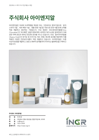 43%uacbd%uc0c1%ubd81%ub3c4 K-%ubdf0%ud2f0 %uc6b0%uc218%uae30%uc5c5 %uc81c%ud488 %uc18c%uac1c%uc9d1%uae00%ub85c%ubc8c%ucf54%uc2a4%uba54%ud2f1%ube44%uc988%ub2c8%uc2a4%uc13c%ud130%uc544%uc774%uc5d4%uc9c0%uc54c%uc740 %ucc28%uc138%ub300 %ub179%uc0c9%ud601%uba85%uc744 %ubaa9%ud45c%ub85c %ud558%ub294 %uadf8%ub9b0%ubc14%uc774%uc624 %ubca4%ucc98%uae30%uc5c5%uc73c%ub85c, %u2018%ubd84%uc790 %uc2a4%uc704%uce58 %uae30%uc220%u2019, %u2018%uc138%ud3ec %ubc30%uc591 %uae30%uc220%u2019, %u2018%uc0dd%ubb3c %uc804%ud658 %uae30%uc220%u2019%uc744 %uae30%ubc18%uc73c%ub85c %ucc9c%uc5f0 %uc2dd%ubb3c %uc720%ub798 %uc18c%uc7ac%ub97c %uc9c1%uc811 %uac1c%ubc1c%ud558%uace0 %uc0dd%uc0b0%ud558%ub294 %uae30%uc5c5%uc785%ub2c8%ub2e4. %uc8fc%uc694 %uc6d0%ub8cc%uc778 %u2018%ud3ec%ub3c4%uaf43%uc138%ud3ec%ucd94%ucd9c%ubb3c(Vino Chocolate)%u2019%uc740 %u2018%ube44%ub2c8%ud398%ub9b0%u2019 %uc131%ubd84%uc774 %ud48d%ubd80%ud558%uba70, %ube44%ud0c0%ubbfcC%ubcf4%ub2e4 62%ubc30, %uc54c%ubd80%ud2f4%ubcf4%ub2e4 13%ubc30 %uac15%ud55c %ubbf8%ubc31 %ud6a8%ub2a5%uacfc %ub6f0%uc5b4%ub09c %ud56d%uc0b0%ud654 %ud6a8%uacfc%ub97c %uc9c0%ub2c8%uace0 %uc788%uc2b5%ub2c8%ub2e4. %ub610%ud55c, %u2018%ubc1c%uc544%uadc0%ub9ac%ucd94%ucd9c%ubb3c(Avena Gold)%u2019%uc740 %uc7a5%uae30%ub2a5 %ubc0f %uc778%uc9c0%uae30%ub2a5 %uac1c%uc120, %ud56d%uc5fc, %ud56d%uc0b0%ud654 %ud6a8%uacfc%ub97c %uc81c%uacf5%ud558%uba70 %uc774%ub97c %uc801%uc6a9%ud55c %ub2e4%uc591%ud55c %uac74%uac15%ubcf4%uc870%uc2dd%ud488%ub3c4 %uc9c1%uc811 %uac1c%ubc1c%ud558%uace0 %uc788%uc2b5%ub2c8%ub2e4. %uc544%uc774%uc5d4%uc9c0%uc54c%uc740 70%uc885 %uc774%uc0c1%uc758 %uc6d0%ub8cc%ub97c %uac1c%ubc1c%ud558%uace0, %uc6d0%ub8cc %uc18c%uc7ac%ubd80%ud130 %uc644%uc81c%ud488%uae4c%uc9c0 %uc774%uc5b4%uc9c0%ub294 %ubca8%ub958%uccb4%uc778%uc744 %uad6c%ucd95%ud558%uace0 %uc788%uc2b5%ub2c8%ub2e4.%uc8fc%uc2dd%ud68c%uc0ac %uc544%uc774%uc5d4%uc9c0%uc54c%ub300 %ud45c%uc8fc %uc18c%uba54 %uc77c%ubc88 %ud638%ud648%ud398%uc774%uc9c0%ud53c %uc7ac %ud638%uacbd%uc0c1%ubd81%ub3c4 %uc548%ub3d9%uc2dc %ud48d%uc0b0%uc74d %uc0b0%uc5c5%ub2e8%uc9c0%uae38 88, 205%ud638cs@ingr.kr1522-0935https://www.ingr.kr%uc8fc%uc2dd%ud68c%uc0ac %uc544%uc774%uc5d4%uc9c0%uc54c