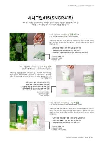 K-BEAUTY EXCELLENT PRODUCTSGlobal Cosmetic Buisness Center46%uc2dc%ub2c8%uadf8%ub9b0415(SNGR415)%ucf8c%uc801%ud558%uace0 %uae68%ub057%ud55c %ud658%uacbd%uc5d0%uc11c %uc790%ub780 %uace0%ucd94%ub0c9%uc774 %uc78e%uc5d0%uc11c %ucd94%ucd9c%ud55c %ucd94%ucd9c%ubb3c%uacfc %uc6d0%ubb3c%uc744 %ubca0%uc774%uc2a4%ub85c %ud55c %ud654%uc7a5%ud488, %uadf8 %uc678 %ub2e4%uc591%ud55c %ub77c%uc774%ud504 %uc2a4%ud0c0%uc77c%uc758 %uc81c%ud488%uc744 %uac1c%ubc1c%ud569%ub2c8%ub2e4.%uc2dc%ub2c8%uadf8%ub9b0415 %uace0%ucd94%ub0c9%uc774%uc78e %uc570%ud50c %ub9c8%uc2a4%ud06cSNGR415 Wasabi Leaf Ampoule Mask%uace0%ucd94%ub0c9%uc774%uc78e %ucd94%ucd9c%ubb3c%uc774 99% %ub4e4%uc5b4%uc788%uc5b4 %ud53c%ubd80%uc5d0 %uae4a%uc740 %ubcf4%uc2b5%uacfc %uc9c4%uc815%uc744 %uc120%uc0ac%ud569%ub2c8%ub2e4. %ud56d%uc0b0%ud654%uc640 %ud56d%uc5fc %ud6a8%uacfc%ub294 %ud53c%ubd80%ub97c %ub9d1%uace0 %uac74%uac15%ud558%uac8c %uac00%uafd4%uc8fc%uba70 %ud658%ud55c %ud53c%ubd80%ub85c%ub9cc%ub4e4%uc5b4%uc90d%ub2c8%ub2e4.%u00b7 %uace0%ucd94%ub0c9%uc774%uc78e %ucd94%ucd9c%ubb3c : %uc678%ubd80 %uc790%uadf9 %ubcf4%ud638 %ubc0f %ud53c%ubd80 %uc9c4%uc815%u00b7 %uc54c%ub85c%uc5d0%ubca0%ub77c%uc78e%uc999 : %uae4a%uc740 %uc218%ubd84 %uacf5%uae09 %ubc0f %ud53c%ubd80 %uc9c4%uc815%u00b7 %ud788%uc54c%ub8e8%ub860%uc0b0 : %ud53c%ubd80 %uc18d %uc218%ubd84 %uc720%uc9c0, %ud0c4%ub825 %ubc0f %ub9e4%ub044%ub7ec%uc6b4 %ud53c%ubd80 %uac1c%uc120%uace0%ucd94%ub0c9%uc774%uc78e %ucd94%ucd9c%ubb3c %ud568%uc720%uc54c%ub85c%uc5d0%ubca0%ub77c%uc78e%uc999 %ud568%uc720%ud788%uc54c%ub8e8%ub860%uc0b0 %ud568%uc720%uc2dc%ub2c8%uadf8%ub9b0415 %uace0%ucd94%ub0c9%uc774%uc78e %ud4e8%uc5b4 %ud1a0%ub2dd %ud328%ub4dcSNGR415 Wasabi Leaf Pure Toning Pad%uace0%ucd94%ub0c9%uc774%uc78e %ucd94%ucd9c%ubb3c%uc744 %ud568%uc720%ud574 %ud53c%ubd80%ub97c %ubd80%ub4dc%ub7fd%uace0 %uae68%ub057%ud558%uac8c %uac00%uafd4%uc8fc%uba70 %ud56d%uc5fc, %ud56d%uc0b0%ud654 %uc131%ubd84%uc774 %ud48d%ubd80%ud574 %ud53c%ubd80%ub97c %uc9c4%uc815%uc2dc%ud0a4%ub294 %ub370 %ub3c4%uc6c0%uc744 %uc90d%ub2c8%ub2e4. %ubd88%ud544%uc694%ud55c %ub178%ud3d0%ubb3c%uacfc %uacfc%uc789%ud53c%uc9c0%ub97c %uc81c%uac70%ud558%uba70 pH%ubc38%ub7f0%uc2a4 %uc870%uc808%uc5d0%ub3c4 %ub3c4%uc6c0%uc744 %uc8fc%ub294 %uc2a4%ud0a8 %ucf00%uc5b4 %uc81c%ud488%uc785%ub2c8%ub2e4.%u00b7 AHA %uc131%ubd84 : %ubb35%uc740 %uac01%uc9c8%uc744 %ubd80%ub4dc%ub7fd%uac8c %uc81c%uac70%u00b7 BHA %uc131%ubd84 : %ubaa8%uacf5 %uc18d %ub178%ud3d0%ubb3c%uacfc %ud53c%uc9c0 %uc815%ub3c8%u00b7 %uace0%ucd94%ub0c9%uc774%uc78e %ucd94%ucd9c%ubb3c : %uc678%ubd80 %uc790%uadf9 %ubcf4%ud638 %ubc0f %ud53c%ubd80 %uc9c4%uc815%u00b7 %uc54c%ub85c%uc5d0%ubca0%ub77c%uc78e%uc999 : %uae4a%uc740 %uc218%ubd84 %uacf5%uae09 %ubc0f %ud53c%ubd80 %uc9c4%uc815%uace0%ucd94%ub0c9%uc774%uc78e %ucd94%ucd9c%ubb3c %ud568%uc720%uc54c%ub85c%uc5d0%ubca0%ub77c%uc78e%uc999 %ud568%uc720AHA, BHA %ud568%uc720%uc2dc%ub2c8%uadf8%ub9b0415 %uace0%ucd94%ub0c9%uc774%uc78e %uadf8%ub9b0 %ubc84%ube14%ud3fcSNGR415 Wasabi Leaf Green Bubble Foam%uace0%ucd94%ub0c9%uc774%uc78e %ucd94%ucd9c %uc131%ubd84%uc744 %ud65c%uc6a9%ud55c %ud074%ub80c%uc9d5%ud3fc%uc73c%ub85c %ud53c%uc9c0%uc640 %ubd88%uc21c%ubb3c%uc744 %ud6a8%uacfc%uc801%uc73c%ub85c %uc81c%uac70%ud558%uace0 %ud53c%ubd80 %uc9c4%uc815%uacfc %uc790%uadf9%uc5c6%ub294 %uc138%uc548%uc744 %uac00%ub2a5%ud558%uac8c %ud569%ub2c8%ub2e4. %ud48d%ubd80%ud558%uace0 %ubd80%ub4dc%ub7ec%uc6b4 %uac70%ud488%uc774 %ud2b9%uc9d5%uc73c%ub85c %ubaa8%uacf5 %uae4a%uc219%uc774 %uc138%uc815%ud558%uc5ec %uc138%uc548 %ud6c4 %ub2f9%uae40%uc5c6%uc774 %ucd09%ucd09%ud55c %ud53c%ubd80%ub97c %uc720%uc9c0%ud569%ub2c8%ub2e4. %u00b7 %ub179%ucc28%ucd94%ucd9c%ubb3c%u00b7%ud2f0%ud2b8%ub9ac%uc78e%ucd94%ucd9c%ubb3c : %uacfc%uc789 %ud53c%uc9c0%uc640 %ub178%ud3d0%ubb3c %uc81c%uac70%u00b7 %uace0%ucd94%ub0c9%uc774%uc78e %ucd94%ucd9c%ubb3c : %uc678%ubd80 %uc790%uadf9 %ubcf4%ud638 %ubc0f %ud53c%ubd80 %uc9c4%uc815%u00b7 %uc54c%ub85c%uc5d0%ubca0%ub77c%uc78e%uc999 : %uae4a%uc740 %uc218%ubd84 %uacf5%uae09 %ubc0f %ud53c%ubd80 %uc9c4%uc815%uace0%ucd94%ub0c9%uc774%uc78e %ucd94%ucd9c%ubb3c %ud568%uc720%uc54c%ub85c%uc5d0%ubca0%ub77c%uc78e%uc999 %ud568%uc720%ub179%ucc28%ucd94%ucd9c%ubb3c%u00b7%ud2f0%ud2b8%ub9ac%uc78e%ucd94%ucd9c%ubb3c