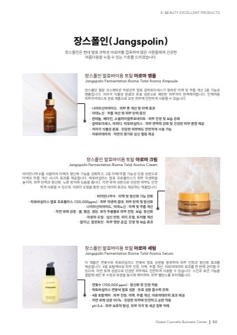 K-BEAUTY EXCELLENT PRODUCTSGlobal Cosmetic Buisness Center50%uc7a5%uc2a4%ud3f4%uc778(Jangspolin)%uc7a5%uc2a4%ud3f4%uc778%uc740 %ud604%ub300 %ubc1c%ud6a8 %uacfc%ud559%uacfc %uc544%ub85c%ub9c8%ub97c %uc811%ubaa9%ud558%uc5ec %ub9ce%uc740 %uc0ac%ub78c%ub4e4%uc5d0%uac8c %uac74%uac15%ud55c %uc544%ub984%ub2e4%uc6c0%uc744 %ub204%ub9b4 %uc218 %uc788%ub294 %uae30%ud68c%ub97c %ub4dc%ub9ac%uaca0%uc2b5%ub2c8%ub2e4.%uc7a5%uc2a4%ud3f4%uc778 %ubc1c%ud6a8%ubc14%uc774%uc634 %ud1a0%ud0c8 %uc544%ub85c%ub9c8 %uc570%ud50cJangspolin Fermentation Biome Total Aroma Ampoule%uc7a5%uc2a4%ud3f4%uc778 %ud790%ub9c1 %ucf54%uc2a4%uba54%ud2f1%uc740 %uc6b0%ub7c9%uade0%uc8fc %ubc1c%ud6a8 %uac08%ub77d%ud1a0%ubbf8%uc138%uc2a4%uac00 %ud568%uc720%ub41c %ubbf8%ubc31 %ubc0f %uc8fc%ub984 %uac1c%uc120 2%uc911 %uae30%ub2a5%uc131 %uc570%ud50c%uc785%ub2c8%ub2e4. %uc800%uc790%uadf9 %uc2dd%ubb3c%uc131 %uc6d0%ub8cc%uc758 %uc720%ud6a8 %uc131%ubd84%uc73c%ub85c %uc608%ubbfc%ud55c %ud53c%ubd80%uae4c%uc9c0 %uc644%ubcbd%ucf00%uc5b4%ud569%ub2c8%ub2e4. %uc778%uccb4%uc801%uc6a9 %ud53c%ubd80%uc790%uadf9%ud14c%uc2a4%ud2b8 %uc644%ub8cc %uc81c%ud488%uc73c%ub85c %ubaa8%ub4e0 %ud53c%ubd80%uc5d0 %uc548%uc804%ud558%uac8c %uc0ac%uc6a9%ud560 %uc218 %uc788%uc2b5%ub2c8%ub2e4.%u00b7 %ub098%uc774%uc544%uc2e0%uc544%ub9c8%uc774%ub4dc : %ud53c%ubd80 %ud1a4 %uac1c%uc120 %ubc0f %ubbf8%ubc31 %ud6a8%uacfc%u00b7 %uc544%ub370%ub178%uc2e0 : %uc8fc%ub984 %uac1c%uc120 %ubc0f %ud53c%ubd80 %ud0c4%ub825 %uc99d%uc9c4%u00b7 %ud310%ud14c%ub180, %ubca0%ud0c0%uc778, %uc18c%ub4d0%ud558%uc774%uc54c%ub8e8%ub85c%ub124%uc774%ud2b8 : %ud53c%ubd80 %uc9c4%uc815 %ubc0f %ubcf4%uc2b5 %uac15%ud654%u00b7 %uac08%ub77d%ud1a0%ubbf8%uc138%uc2a4, %ube44%ud53c%ub2e4, %ub77d%ud1a0%ubc14%uc2e4%ub7ec%uc2a4 : %ud53c%ubd80 %uba74%uc5ed%ub825 %uac15%ud654 %ubc0f %uac74%uac15%ud55c %ud53c%ubd80 %ud658%uacbd %uc81c%uacf5%u00b7 %uc800%uc790%uadf9 %uc2dd%ubb3c%uc131 %uc6d0%ub8cc : %ubbfc%uac10%ud55c %ud53c%ubd80%uc5d0%ub3c4 %uc548%uc804%ud558%uac8c %uc0ac%uc6a9 %uac00%ub2a5%u00b7 %uc544%ub85c%ub9c8%ud14c%ub77c%ud53c : %uc790%uc5f0%uc758 %ud5a5%uae30%ub85c %uc2ec%uc2e0 %ud790%ub9c1 %uc81c%uacf5%uc7a5%uc2a4%ud3f4%uc778 %ubc1c%ud6a8%ubc14%uc774%uc634 %ud1a0%ud0c8 %uc544%ub85c%ub9c8 %ud06c%ub9bcJangspolin Fermentation Biome Total Aroma Cream%ube44%ud0c0%ubbfc%ub098%ubb34%uc218%ub97c %uc0ac%uc6a9%ud558%uc5ec %ubbf8%ubc31%uacfc %ud5a5%uc0b0%ud654 %uae30%ub2a5%uc744 %uac15%ud654%ud558%uace0, 2%uc911 %ubbf8%ubc31/%uc8fc%ub984 %uae30%ub2a5%uc131 %uc778%uc99d %uc131%ubd84%uc73c%ub85c %ubbf8%ubc31%uacfc %uc8fc%ub984 %uac1c%uc120 %uc2dc%ub108%uc9c0 %ud6a8%uacfc%ub97c %uc81c%uacf5%ud569%ub2c8%ub2e4. %ub77d%ud1a0%ubc14%uc2e4%ub7ec%uc2a4 %ubc1c%ud6a8 %ud504%ub85c%ud3f4%ub9ac%uc2a4%uac00 %ud53c%ubd80 %uc790%uc0dd%ub825%uc744 %ub192%uc774%uba70, %ud53c%ubd80 %ud0c4%ub825%uacfc %ud56d%uc0b0%ud654, %ub178%ud654 %ubc29%uc9c0%uc5d0 %ub3c4%uc6c0%uc744 %uc90d%ub2c8%ub2e4. %uc790%uc5f0 %uc720%ub798 %uc131%ubd84%uc73c%ub85c %ubbfc%uac10%ud55c %ud53c%ubd80%ub3c4 %uc548%uc804%ud558%uac8c %uc0ac%uc6a9%ud560 %uc218 %uc788%uc73c%uba70, %uc544%ub85c%ub9c8 %uc624%uc77c%uc744 %ud1b5%ud55c %uc2ec%uc2e0 %ud14c%ub77c%ud53c %ud6a8%uacfc%ub3c4 %uc81c%uacf5%ud558%ub294 %uc81c%ud488%uc785%ub2c8%ub2e4.%u00b7 %ube44%ud0c0%ubbfc%ub098%ubb34%uc218 : %ubbf8%ubc31 %ubc0f %ud56d%uc0b0%ud654 %uae30%ub2a5 %uac15%ud654%u00b7 %ub77d%ud1a0%ubc14%uc2e4%ub7ec%uc2a4 %ubc1c%ud6a8 %ud504%ub85c%ud3f4%ub9ac%uc2a4 (120,000ppm) : %ud53c%ubd80 %uc790%uc0dd%ub825 %uc99d%ub300, %ud53c%ubd80 %ud0c4%ub825 %ubc0f %ud56d%uc0b0%ud654%u00b7 %ub098%uc774%uc544%uc2e0%uc544%ub9c8%uc774%ub4dc, %uc544%ub370%ub178%uc2e0 : %ubbf8%ubc31 %ubc0f %uc8fc%ub984 %uac1c%uc120%u00b7 %uc790%uc5f0 %uc720%ub798 %uc131%ubd84 : %uafc0, %ud669%uae08, %uc0dd%uac15, %uc720%uc790 %ucd94%ucd9c%ubb3c%ub85c %ud53c%ubd80 %uc9c4%uc815, %ubcf4%uc2b5, %ud56d%uc0b0%ud654%u00b7 %uc544%ub85c%ub9c8 %uc624%uc77c : %uc2ec%uc2e0 %uc548%uc815, %ud53c%uc9c0 %uc870%uc808, %ud2b8%ub7ec%ube14 %uac1c%uc120%u00b7 %uc54c%uc9c0%ub2cc, %uc54c%ub780%ud1a0%uc778 : %ud53c%ubd80 %uc601%uc591 %uacf5%uae09, %uc9c4%uc815 %ubc0f %ubcf4%uc2b5 %ud6a8%uacfc%uc7a5%uc2a4%ud3f4%uc778 %ubc1c%ud6a8%ubc14%uc774%uc634 %ud1a0%ud0c8 %uc544%ub85c%ub9c8 %uc138%ub7fcJangspolin Fermentation Biome Total Aroma Serum%uc774 %uc81c%ud488%uc740 %uc5f0%uaf43%uc218%uc640 %ub77d%ud1a0%ubc14%uc2e4%ub7ec%uc2a4 %uc5f0%uaf43%uc528 %ubc1c%ud6a8 %uc131%ubd84%uc744 %ud568%uc720%ud558%uc5ec %ud53c%ubd80 %uc9c4%uc815%uacfc %ud56d%uc0b0%ud654 %ud6a8%uacfc%ub97c %uc81c%uacf5%ud569%ub2c8%ub2e4. 4%uc911 %ud1a0%ud0c8%ucf00%uc5b4%ub85c %ud53c%ubd80 %uc9c4%uc815, %ubbf8%ubc31, %uc8fc%ub984 %uac1c%uc120, %uc544%ub85c%ub9c8%ud14c%ub77c%ud53c %ud6a8%uacfc%ub97c %ud55c %ubc88%uc5d0 %uad00%ub9ac%ud560 %uc218 %uc788%uc73c%uba70, %uc790%uc5f0 %uc720%ub798 %uc131%ubd84%uc73c%ub85c %ubbfc%uac10%ud55c %ud53c%ubd80%uc5d0%ub3c4 %uc548%uc804%ud558%uac8c %uc0ac%uc6a9%ud560 %uc218 %uc788%uc2b5%ub2c8%ub2e4. %uc2a4%ud0a8%uacfc %ub85c%uc158 %uae30%ub2a5%uc744 %uacb0%ud569%ud574 %uc138%uc548 %ud6c4 %uc218%ubd84%uacfc %uc720%ubd84%uc744 %ub3d9%uc2dc%uc5d0 %ucf00%uc5b4%ud558%uba70, %ud53c%ubd80 %ubc38%ub7f0%uc2a4%ub97c %uc720%uc9c0%ud574%uc90d%ub2c8%ub2e4.%u00b7 %uc5f0%uaf43%uc218 (700,000 ppm) : %ud56d%uc0b0%ud654 %ubc0f %uc9c4%uc815 %uc791%uc6a9%u00b7 %ub77d%ud1a0%ubc14%uc2e4%ub7ec%uc2a4 %uc5f0%uaf43%uc528 %ubc1c%ud6a8 %uc131%ubd84 : %uc720%ud6a8 %uc131%ubd84 %ud761%uc218%ub825 %uac15%ud654%u00b7 4%uc911 %ud1a0%ud0c8%ucf00%uc5b4 : %ud53c%ubd80 %uc9c4%uc815, %ubbf8%ubc31, %uc8fc%ub984 %uac1c%uc120, %uc544%ub85c%ub9c8%ud14c%ub77c%ud53c %ud6a8%uacfc %uc81c%uacf5%u00b7 %uc790%uc5f0 %uc720%ub798 %uc131%ubd84 90% : %ubbfc%uac10%ud55c %ud53c%ubd80%uc5d0 %uc548%uc804%ud558%uace0 %uc21c%ud55c %uc791%uc6a9%u00b7 pH 5.6 : %ud53c%ubd80 %ubcf4%ud638%ub9c9 %ud615%uc131, %uc678%ubd80 %uc790%uadf9 %ubc0f %uc138%uade0 %uce68%ud22c %uc5b5%uc81c