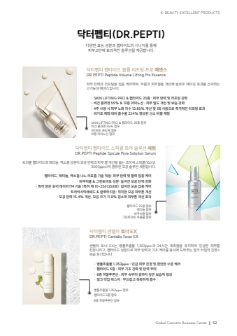 K-BEAUTY EXCELLENT PRODUCTSGlobal Cosmetic Buisness Center52%ub2e5%ud130%ud3a9%ud2f0(DR.PEPTI)%ub2e4%uc591%ud55c %ud6a8%ub2a5 %uc131%ubd84%uacfc %ud3a9%ud0c0%uc774%ub4dc%uc758 %uc2dc%ub108%uc9c0%ub97c %ud1b5%ud574%ud53c%ubd80%uace0%ubbfc%uc5d0 %ud6a8%uacfc%uc801%uc778 %uc194%ub8e8%uc158%uc744 %uc81c%uacf5%ud569%ub2c8%ub2e4.%ub2e5%ud130%ud3a9%ud2f0 %ud3a9%ud0c0%uc774%ub4dc %ubcfc%ub968 %ub9ac%ud504%ud305 %ud504%ub85c %uc5d0%uc13c%uc2a4DR.PEPTI Peptide Volume Lifting Pro Essence%ud53c%ubd80 %ud0c4%ub825%uacfc %ub9ac%ud504%ud305%uc744 %uc9d1%uc911 %ucf00%uc5b4%ud558%uba70, %uc8fc%ub984%uacfc %ud53c%ubd80%uacb0%uc744 %uac1c%uc120%ud574 %uc2ac%ub85c%uc6b0 %uc5d0%uc774%uc9d5 %ud6a8%uacfc%ub97c %uc120%uc0ac%ud558%ub294 %uace0%uae30%ub2a5%uc131 %uc5d0%uc13c%uc2a4%uc785%ub2c8%ub2e4.%u00b7 SKIN LIFTING PRO & %ud3a9%ud0c0%uc774%ub4dc 25%uc885 : %ud53c%ubd80 %ud0c4%ub825 %ubc0f %ub9ac%ud504%ud305 %uac15%ud654%u00b7 %ube44%uac74 %ucf5c%ub77c%uac90 55% & 19%uc885 %uc544%ubbf8%ub178%uc0b0 : %ud53c%ubd80 %ubc00%ub3c4 %uac1c%uc120 %ubc0f %ubcf4%uc2b5 %uac15%ud654%u00b7 4%uc8fc %uc0ac%uc6a9 %uc2dc %ud53c%ubd80 %ub178%ud654 %uc9c0%uc218 13.85% %uac1c%uc120 %ubc0f 1%ud68c %uc0ac%uc6a9%uc73c%ub85c %uc989%uac01%uc801%uc778 %ub9ac%ud504%ud305 %ud6a8%uacfc%u00b7 %ube44%uae30%ud3ec %uc81c%ud615 %ub300%ube44 %ud761%uc218%uc728 224% %ud5a5%uc0c1%ub41c %uc0b0%uc18c %ubc84%ube14 %uc81c%ud615SKIN LIFTING PRO & %ud3a9%ud0c0%uc774%ub4dc 25%uc885 %ud568%uc720%ube44%uac74 %ucf5c%ub77c%uac90 55% %ud568%uc720%ube44%ud0c0%ubbfcE %uc720%ub3c4%uccb4 %ud568%uc72019%uc885 %uc544%ubbf8%ub178%uc0b0 %ud568%uc720%ub2e5%ud130%ud3a9%ud2f0 %uc13c%ud154%ub77c %ud1a0%ub108 EXDR.PEPTI Centella Toner EX%uc13c%ud154%ub77c %ud1a0%ub108 EX%ub294 %ubcd1%ud480%ucd94%ucd9c%ubb3c 1,353ppm%uacfc 24%uc2dc%uac04 %ucd09%ucd09%ud568%uc744 %uc720%uc9c0%ud558%uba70 %ubbfc%uac10%ud55c %ud53c%ubd80%ub97c %uc9c4%uc815%uc2dc%ud0a4%uace0, %ud3a9%ud0c0%uc774%ub4dc %uc131%ubd84%uc73c%ub85c %ud53c%ubd80 %ud0c4%ub825%uacfc %uae30%ucd08 %ucf00%uc5b4%ub97c %ub3d9%uc2dc%uc5d0 %ub3c4%uc640%uc8fc%ub294 %ubc00%ud06c %ud0c0%uc785%uc758 %uc9c4%uc815+%ubcf4%uc2b5 %ud1a0%ub108%uc785%ub2c8%ub2e4.%u00b7 %ubcd1%ud480%ucd94%ucd9c%ubb3c 1,353ppm : %ubbfc%uac10 %ud53c%ubd80 %uc9c4%uc815 %ubc0f %ud3b8%uc548%ud55c %uc218%ubd84 %ucf00%uc5b4%u00b7 %ud3a9%ud0c0%uc774%ub4dc 5%uc885 : %ud53c%ubd80 %uae30%ucd08 %uac15%ud654 %ubc0f %ud0c4%ub825 %ubd80%uc5ec%u00b7 8%uc911 %ud788%uc54c%ub8e8%ub860%uc0b0 : %ud53c%ubd80 %uc18d%ubd80%ud130 %uac89%uae4c%uc9c0 %uae4a%uc740 %ubcf4%uc2b5%ub9c9 %ud615%uc131%u00b7 %ubc00%ud06c %ud0c0%uc785 %ud14d%uc2a4%ucc98 : %ubd80%ub4dc%ub7fd%uace0 %ucd09%ucd09%ud558%uac8c %ud761%uc218%ubcd1%ud480%ucd94%ucd9c%ubb3c 1,353ppm %ud568%uc720%ud3a9%ud0c0%uc774%ub4dc 5%uc885 %ud568%uc7208%uc911 %ud788%uc54c%ub8e8%ub860%uc0b0 %ud568%uc720%ub2e5%ud130%ud3a9%ud2f0 %ud3a9%ud0c0%uc774%ub4dc %uc2a4%ud53c%ud058 %ud3ec%uc5b4 %uc194%ub8e8%uc158 %uc138%ub7fcDR.PEPTI Peptide Spicule Pore Solution Serum%ud2b8%ub9ac%ud50c %ud3a9%ud0c0%uc774%ub4dc%uc640 %ub808%ud2f0%ub180, %uc5d1%uc18c%uc880 %uc131%ubd84%uc774 %ubaa8%uacf5 %ud0c4%ub825%uacfc %ud53c%ubd80 %uacb0 %uac1c%uc120%uc744 %ub3d5%ub294 %ucd08%ubbf8%uc138 %uc2a4%ud53c%ud058(150%uc0f7,3000ppm)%uc774 %ud568%uc720%ub41c %ubaa8%uacf5 %uc194%ub8e8%uc158 %uc138%ub7fc%uc785%ub2c8%ub2e4.%u00b7 %ud3a9%ud0c0%uc774%ub4dc, %ub808%ud2f0%ub180, %uc5d1%uc18c%uc880 %ub098%ub178 %ub9ac%ud3ec%uc880 %uae30%uc220 %uc801%uc6a9: %ud53c%ubd80 %ud0c4%ub825 %ubc0f %ud65c%ub825 %uc9d1%uc911 %ucf00%uc5b4%u00b7 %ubc14%ucfe0%uce58%uc62c & %uadf8%ub9b0%ud1a0%ub9c8%ud1a0 %uc131%ubd84: %ub298%uc5b4%uc9c4 %ubaa8%uacf5 %ud0c4%ub825 %uac15%ud654%u00b7 %ud2b9%ud5c8 %ubc1b%uc740 %ud3ec%uc5b4 %ub808%uc774%uc800TM %uae30%uc220 (%ud2b9%ud5c8 %uc81c 10-2561258%ud638): %ub113%uc5b4%uc9c4 %ubaa8%uacf5 %uc9d1%uc911 %ucf00%uc5b4%u00b7 %ud2b8%ub77c%ub125%uc0ac%ubbf9%uc560%uc528%ub4dc & %uae00%ub8e8%ud0c0%uce58%uc628: %uce59%uce59%ud55c %ubaa8%uacf5 %ud53c%ubd80%ud1a4 %uac1c%uc120%u00b7 %ubaa8%uacf5 %ud0c4%ub825 15.4% %uac1c%uc120, %ubaa8%uacf5 %ud06c%uae30 11.8% %uac10%uc18c%uc640 %ud53c%ubd80%ud1a4 %uac1c%uc120 %ud6a8%uacfc%ud3a9%ud0c0%uc774%ub4dc 25%uc885 %ud568%uc720%ub808%ud2f0%ub180 %ud568%uc720%ubc14%ucfe0%uce58%uc62c %ud568%uc720%uadf8%ub9b0%ud1a0%ub9c8%ud1a0 %ucd94%ucd9c%ubb3c %ud568%uc720